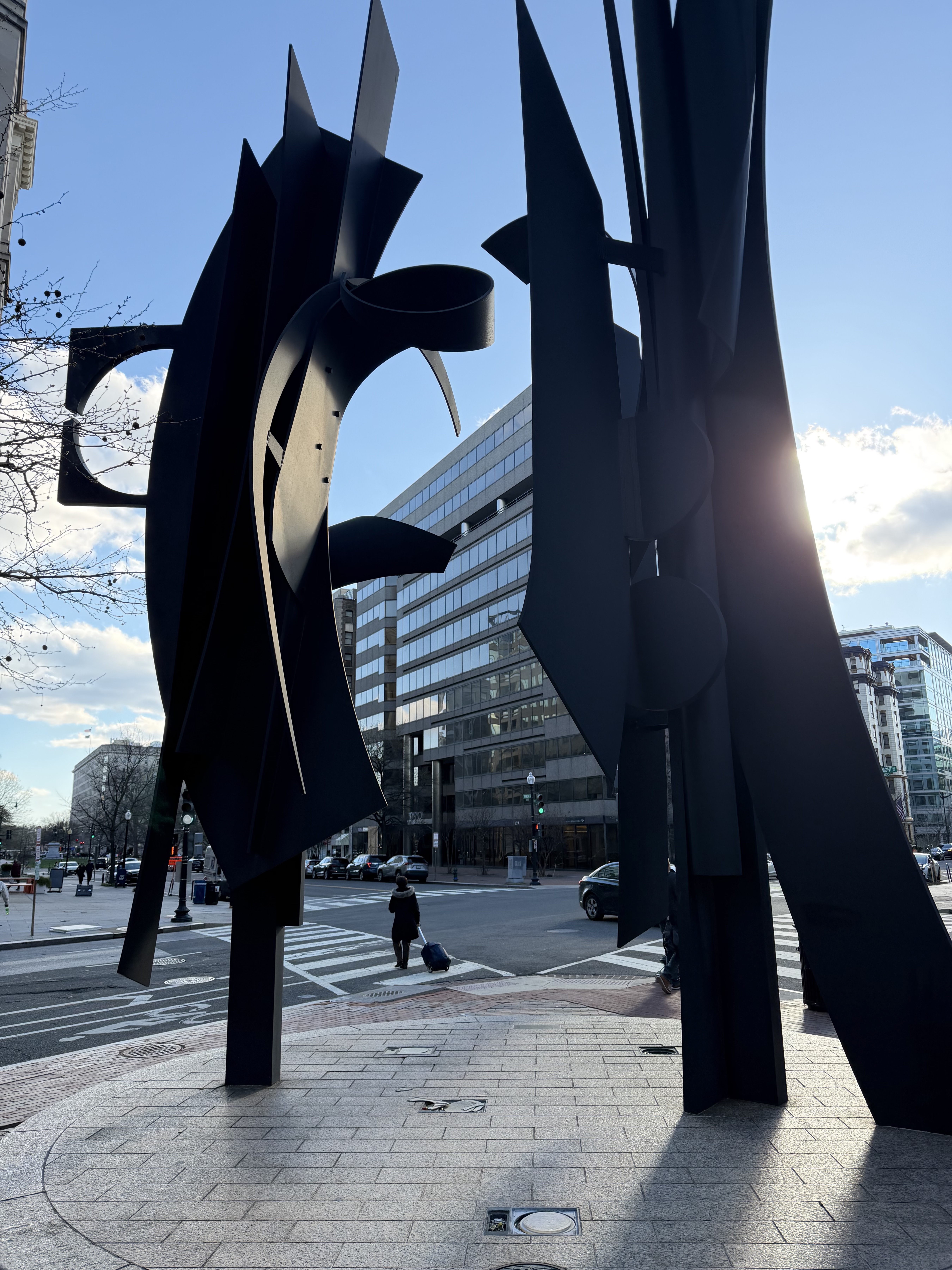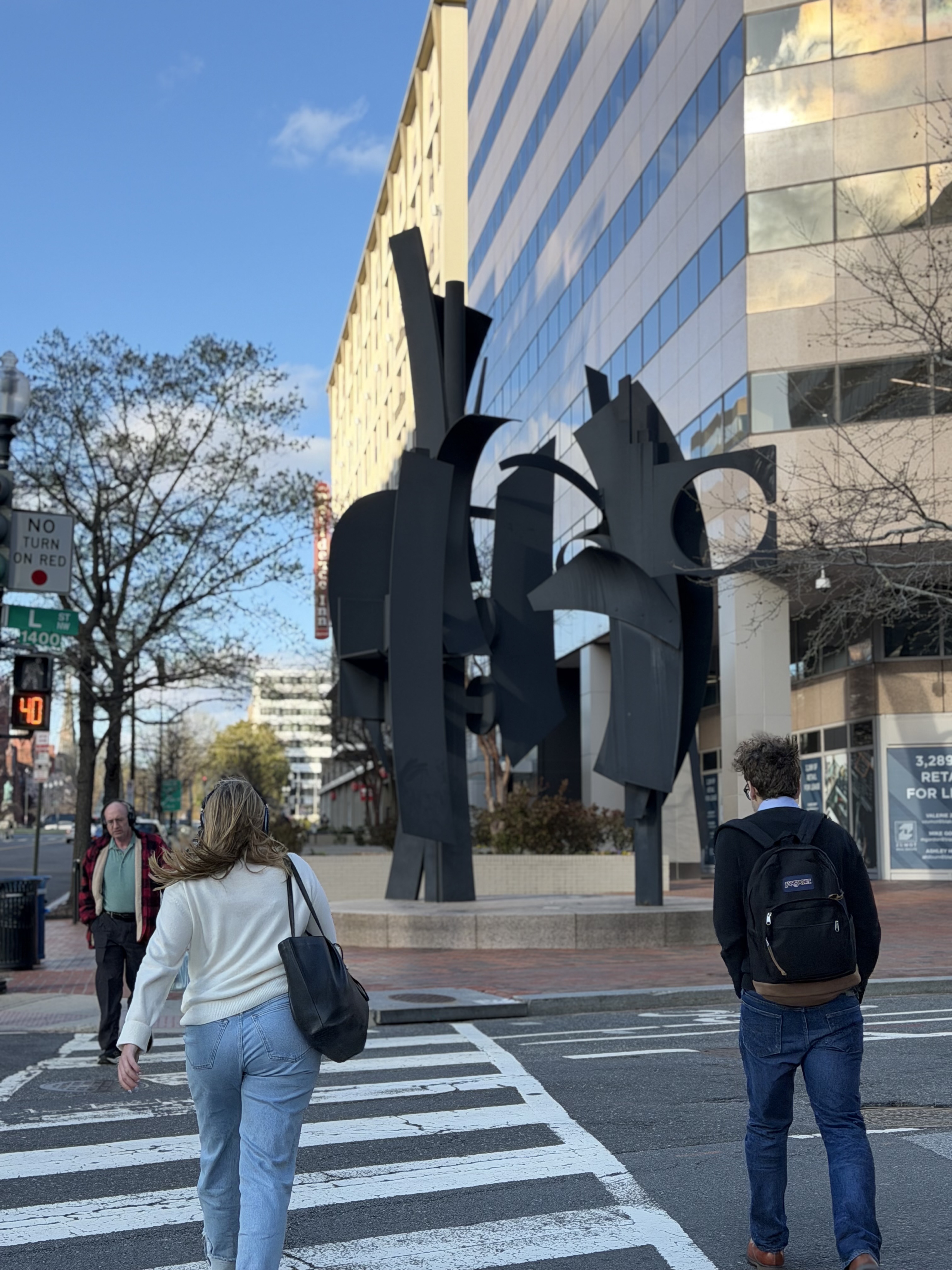 Sculpture consists of two separate pieces that stand next to each other to create the overall structure. Set atop a granite base. Total height 30 feet (approximately 914 cm). Featured as a stop on the Abstract Sculptures of DC tour. Building behind the sculpture bears signage reading '3,400 SF Retail For Lease'. Building address visible as 1701.
