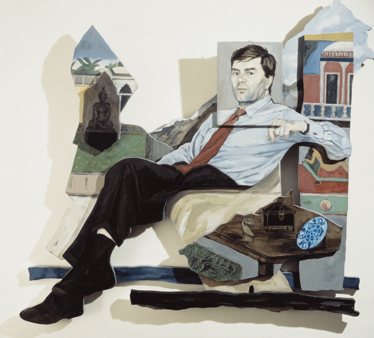 William is a commanding shaped portrait by Lucien Rees Roberts, painted in 1986, depicting a man reclining in a chair rendered with a fragmented, collage-like composition that layers architectural vignettes, a Buddhist statue, a blue and white ceramic plate, and landscape elements around the sitter. The work's irregular silhouette blurs the boundary between painting and sculpture, giving the panel a distinctive three-dimensional presence. Painted within a year of Rees Roberts co-founding his architectural practice with Steven Harris, the piece reflects his dual sensibility as both architect and portraitist. At 50 by 51 inches, it is a large format, highly resolved work that exemplifies the artist's mature fusion of portraiture with environmental and cultural symbolism.
