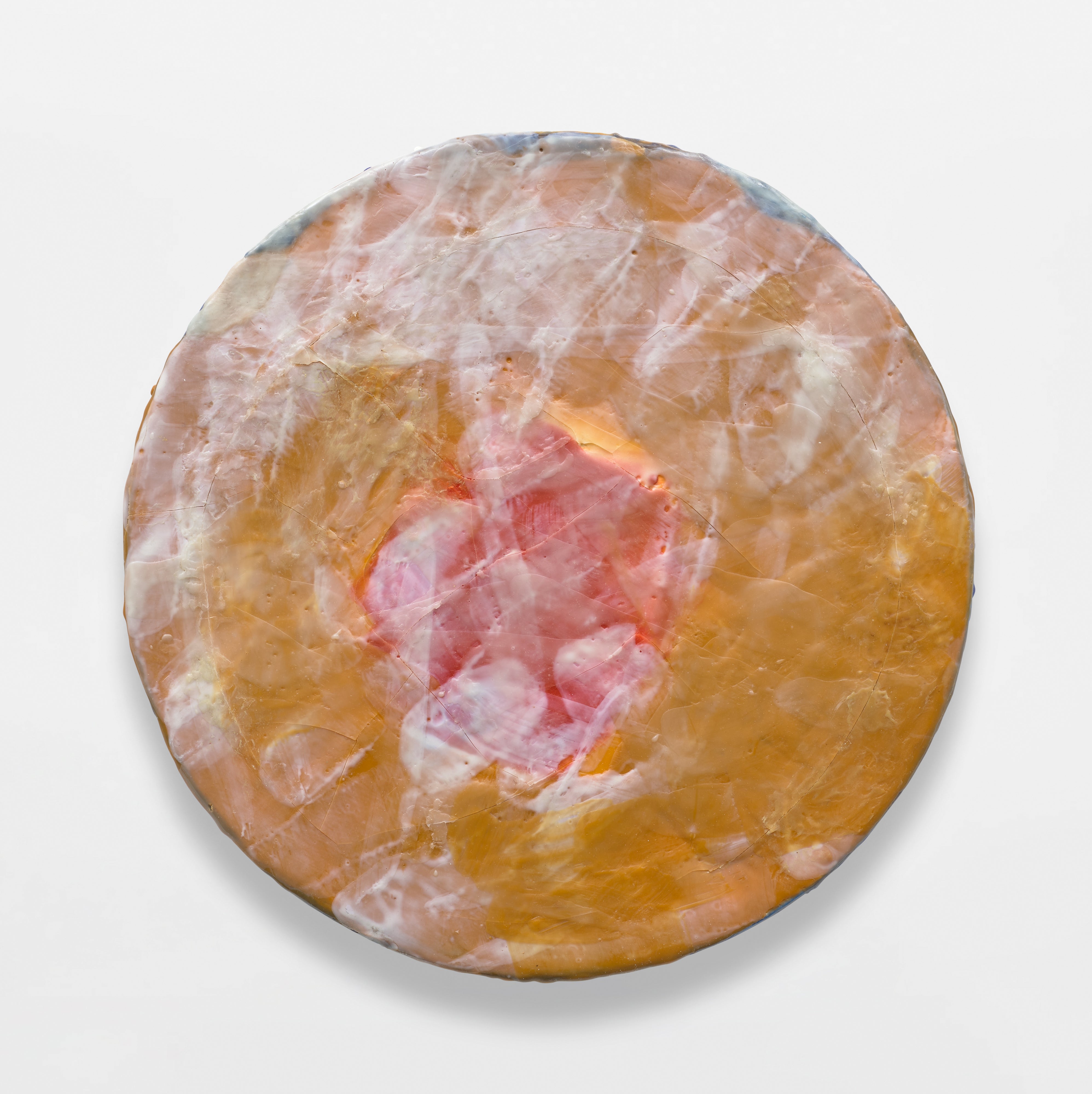 Lynda Benglis's *Flesh Spot* (1993) is a richly tactile work in which purified pigmented beeswax and dammar resin are applied to canvas, creating a luminous, skin-like surface that seems to glow from within. The organic warmth of the beeswax medium evokes the body and its materiality, aligning with Benglis's longstanding exploration of sensuality, process, and form. The painting's title reinforces this corporeal intimacy, suggesting a close, almost microscopic attention to flesh as both subject and substance.