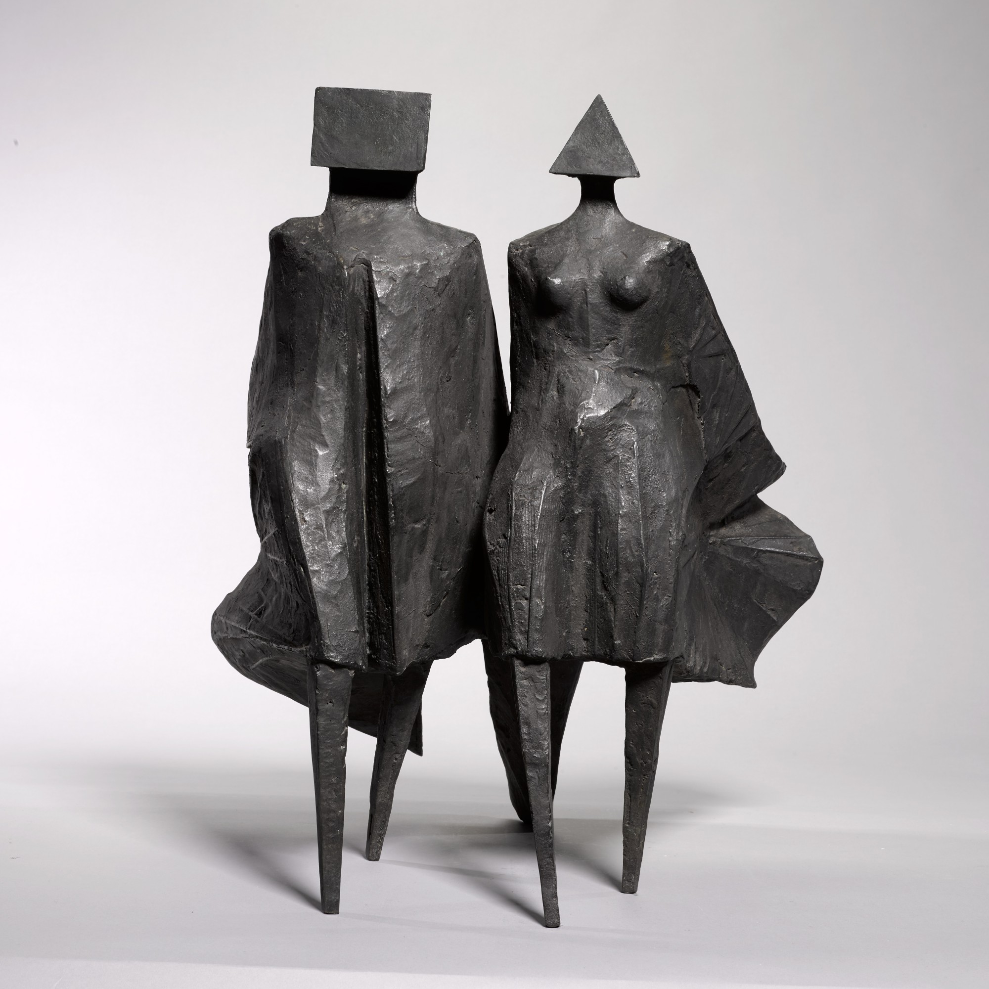 A bronze sculpture by Lynn Chadwick from 1977 titled Cloaked Couple I, featuring two abstracted human figures. The work explores themes of human connection and isolation through modernist sculptural forms.