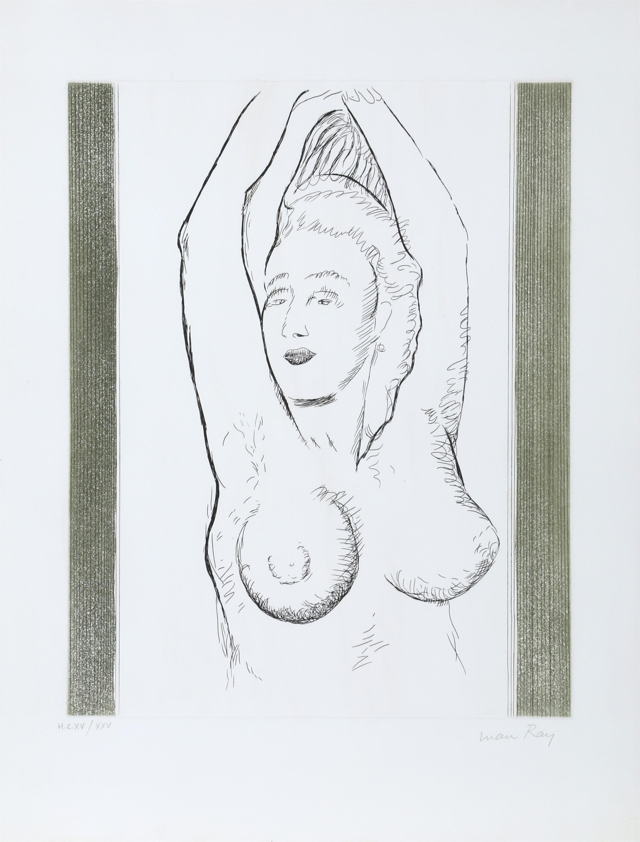 "Sonia" is an etching with aquatint by Man Ray created in the 1920s, exemplifying his experimental approach to printmaking during his Paris period. The work demonstrates Ray's characteristic blend of Dada sensibilities and surrealist imagery, utilizing the technical possibilities of aquatint to create tonal variations and atmospheric effects. The print reflects Ray's broader interest in exploring unconventional artistic techniques and his engagement with portraiture as a vehicle for abstraction and psychological exploration.