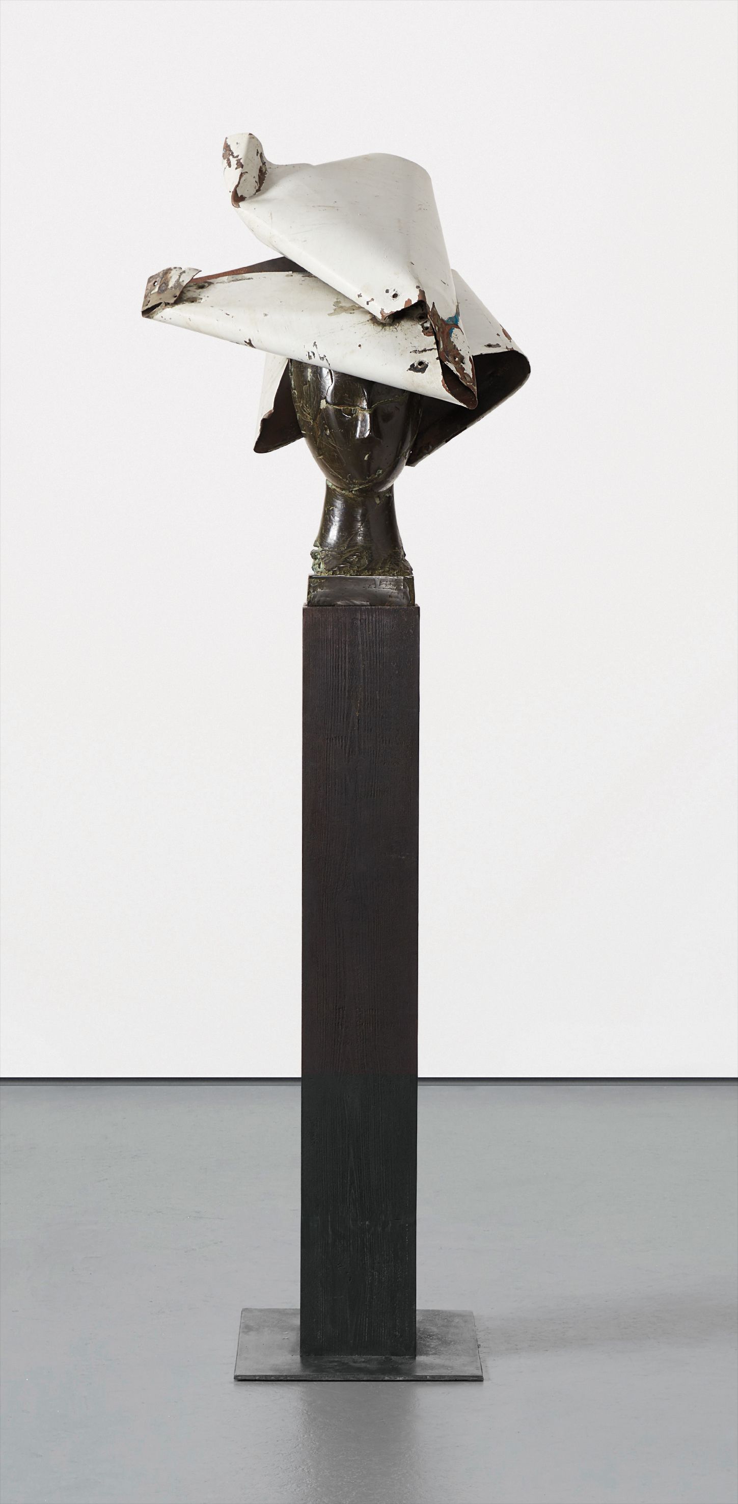 Manolo Valdés' 'Katia II' combines bronze sculpture with painted steel elements, creating a hybrid work that bridges traditional sculptural materials with contemporary practice. The dark green patina and steel components create visual and textural contrast in this two-part composition.