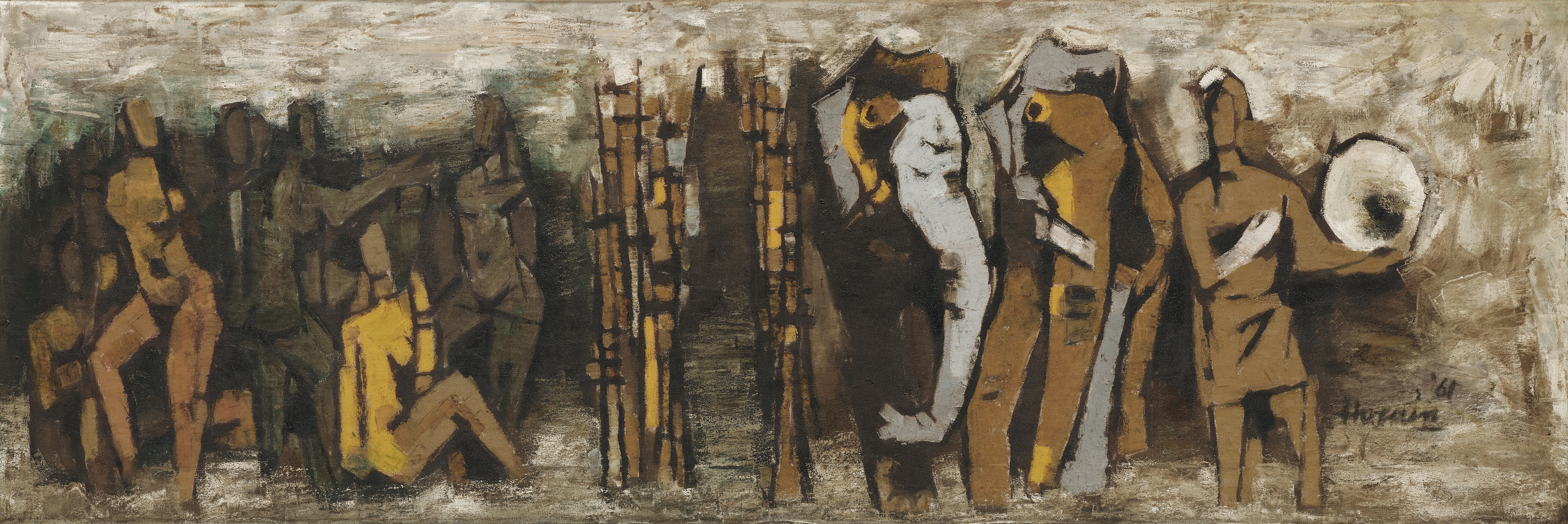 In "Seven Shades [...] Bamboos," Maqbool Fida Husain employs oil on canvas to capture the elegant verticality and organic rhythm of bamboo forests through his characteristic modernist abstraction. The work demonstrates Husain's masterful use of color gradation and form, where the titular "seven shades" likely refer to varying tones that create depth and movement across the composition. Through this piece, Husain bridges his interest in Indian subjects and natural forms with a distinctly contemporary aesthetic vocabulary.
