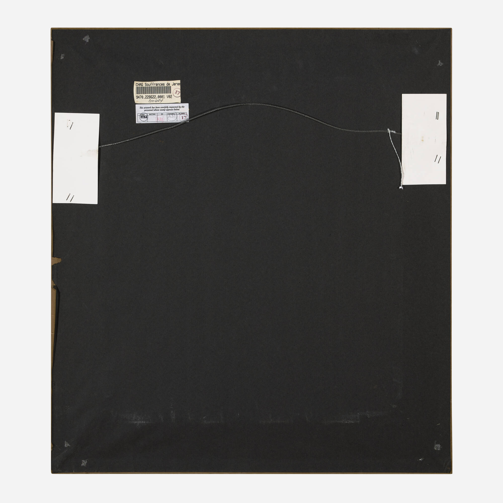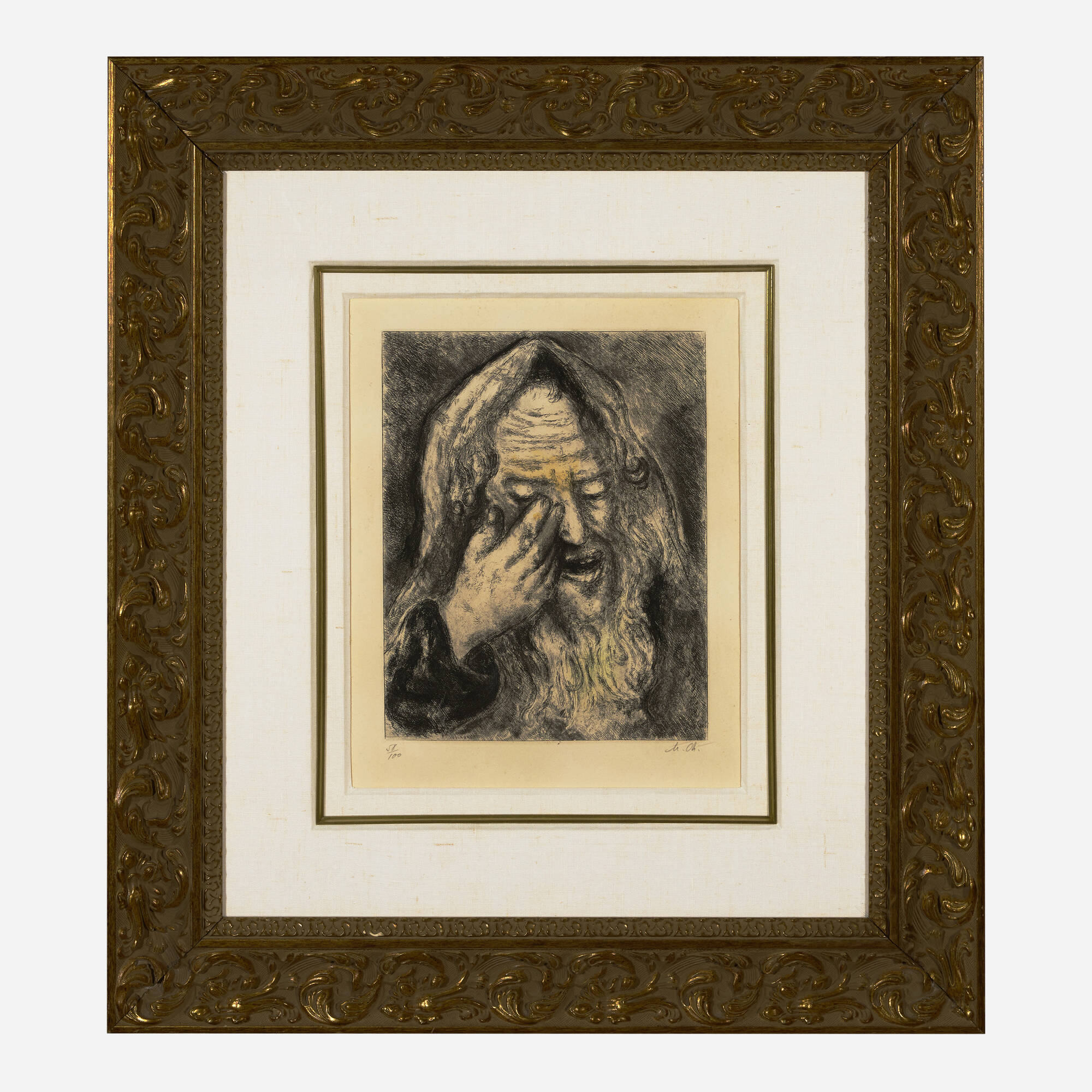 Souffrance de Jérémie, meaning Suffering of Jeremiah, is an etching from Marc Chagall's La Bible portfolio created in 1958. The work combines etching with hand coloring to bring the biblical narrative to vivid life. Chagall's interpretation of the prophet Jeremiah's suffering reflects his deep engagement with religious and historical themes throughout his career. The hand-colored elements add warmth and personal touch to the classical etching technique.