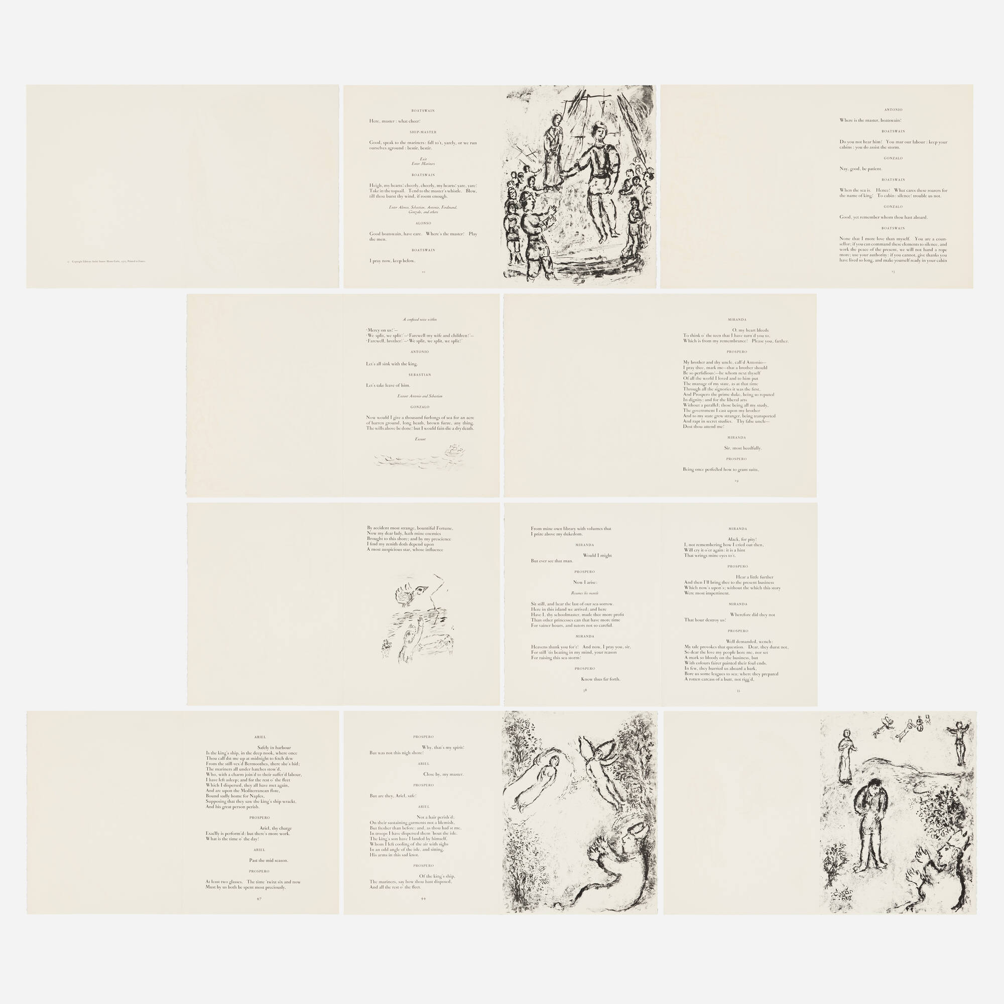 This lithograph by Marc Chagall illustrates a scene from William Shakespeare's famous play The Tempest. Created in 1975, the work is printed on Arches paper, a high quality medium favored by fine artists. The composition captures the dramatic and fantastical elements characteristic of both the playwright's work and Chagall's imaginative style. The piece reflects Chagall's lifelong engagement with literary themes and his ability to translate written narratives into visual language.