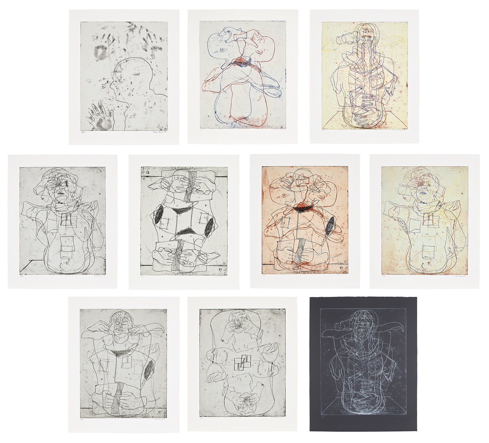 "Emotional Detoxification" is a significant portfolio work by Marc Quinn comprising ten etchings and drypoints, four of which incorporate color, presented across nine sheets of Somerset Satin paper and one of Arches Noir paper. The suite demonstrates Quinn's engagement with printmaking techniques and his exploration of psychological and corporeal themes through the medium's inherent capacity for layering and mark making. The work is housed in its original burgundy buckram portfolio with printed identification, preserving the artist's intentional presentation of the complete set as a unified conceptual statement.
