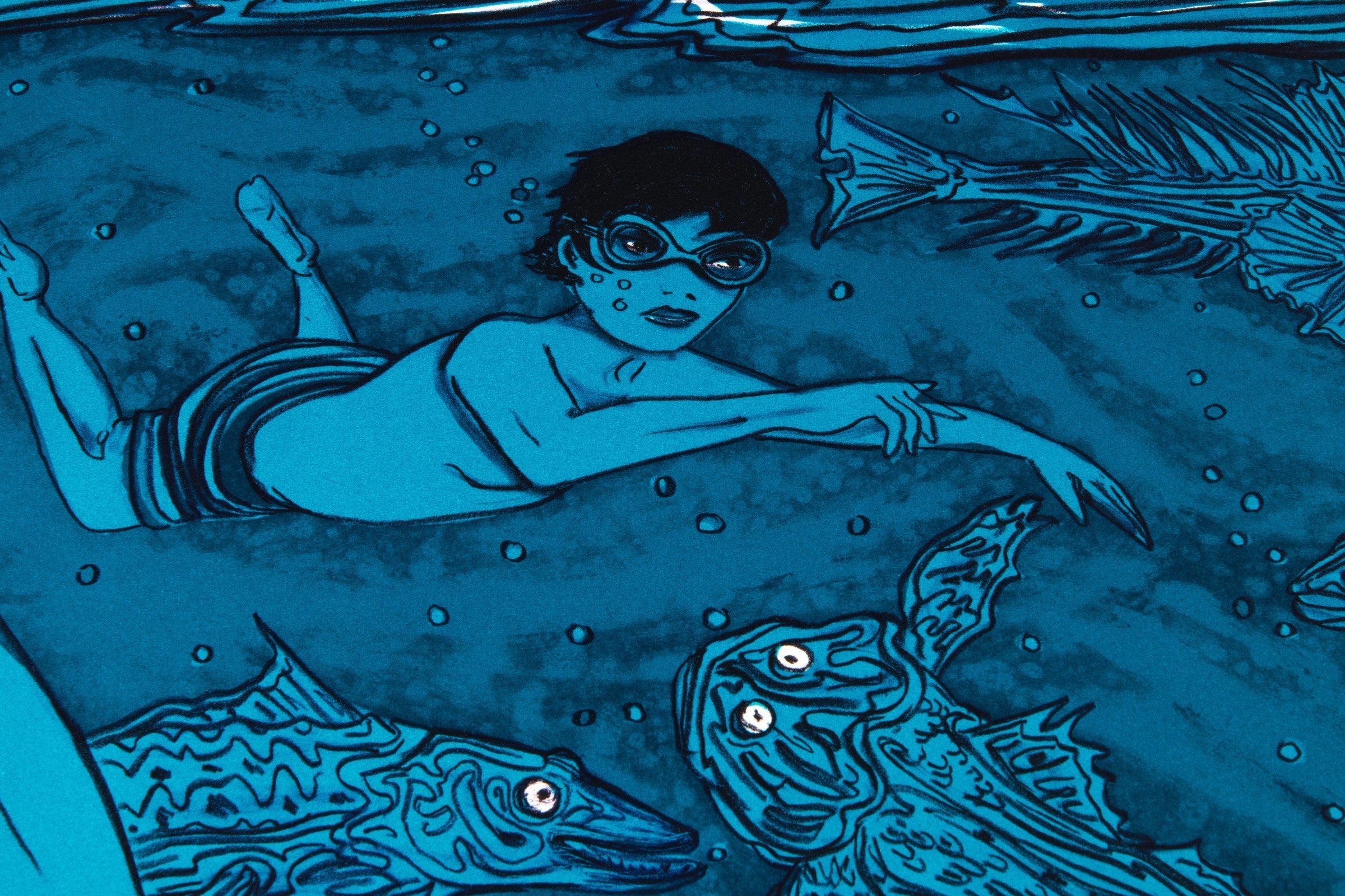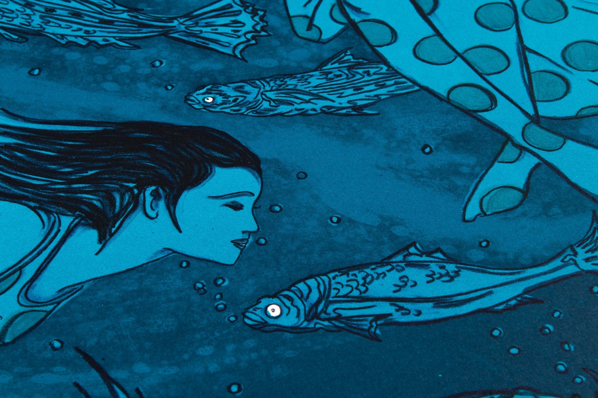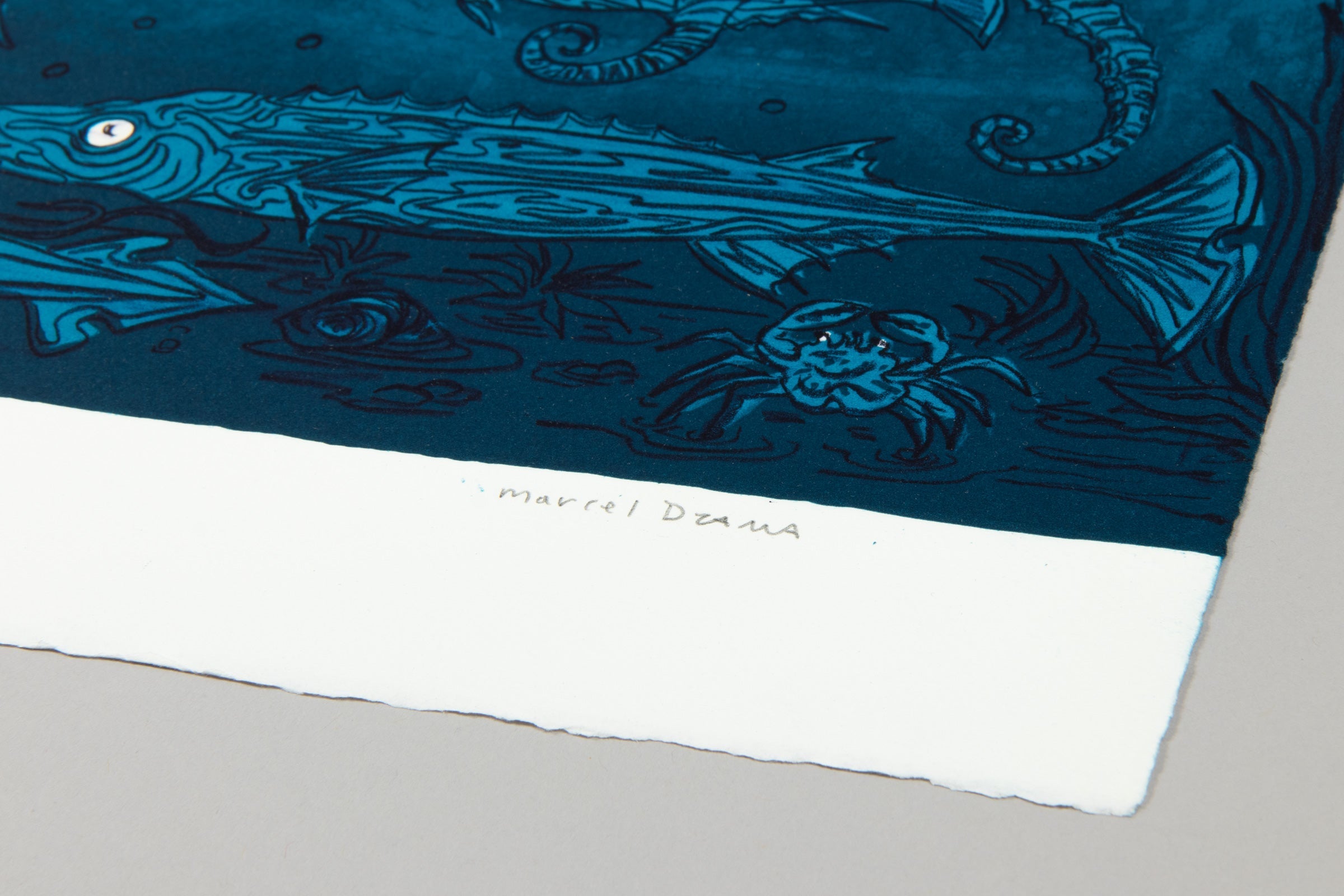 Marcel Dzama ’s Midnights Moon Light (2023) is a signed limited edition lithograph on Velin d’Arches paper measuring 100 × 68 cm. A luminous moon hovers above a dark, rippling sea, while beneath the surface a cast of swimmers, fish, and seahorses unfolds in a densely imagined underwater tableau. Rendered in Dzama’s characteristic palette of inky blacks and deep blues, the artwork's composition blends folklore, fantasy, and subtle unease. The watchful moon and star-studded sky introduce a theatrical, almost stage-like atmosphere, while the submerged figures evoke themes of transformation, vulnerability, and dream logic. As in much of Dzama’s work, narrative remains open-ended, inviting the viewer into a poetic world that oscillates between innocence and quiet tension. Published in 2023 in a limited edition of 70 plus 7 artist’s proofs, this fine art print is hand-signed and numbered in pencil by the artist, representing a striking example of Dzama’s contemporary print practice.