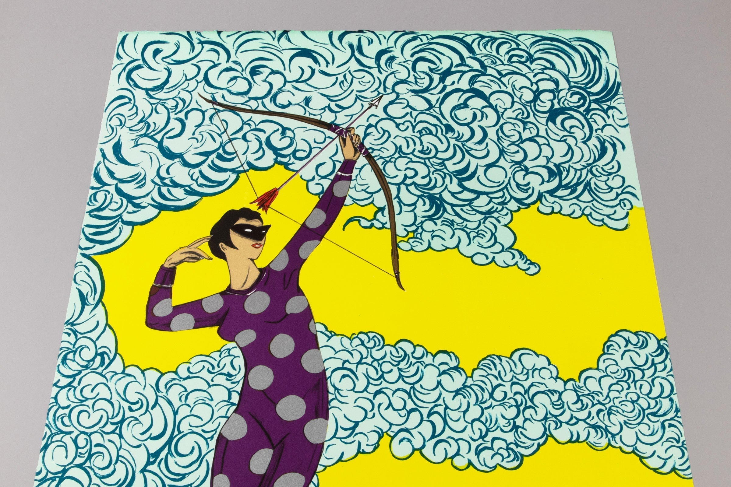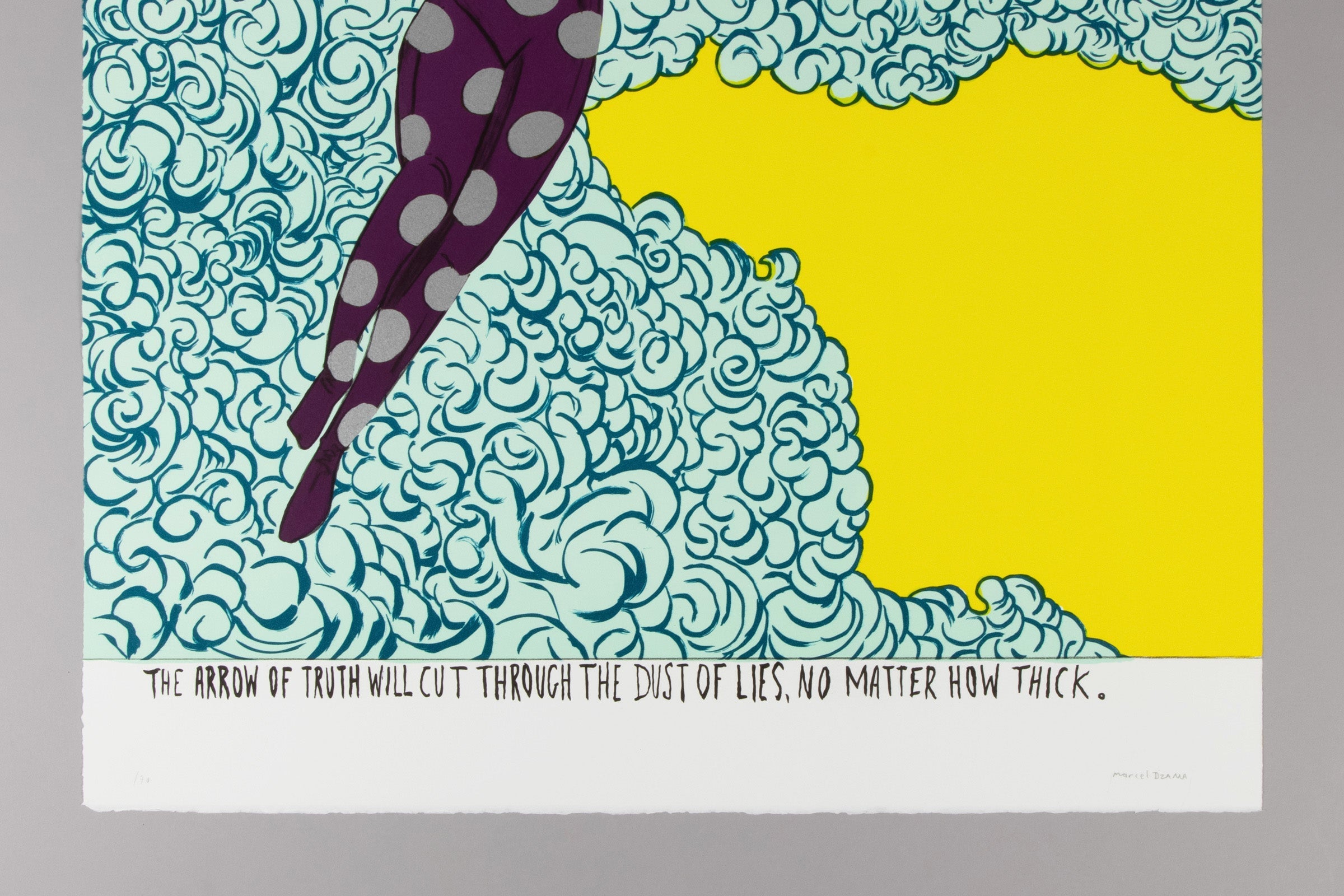 Marcel Dzama 's The Arrow of Truth (2023) is a limited edition lithograph that depicts a masked female archer suspended among swirling blue clouds set against a field of vivid yellow. Rendered in Dzama's distinctive graphic style, the figure recalls mythological and allegorical imagery while asserting a clear sense of agency and resolve. The composition is accompanied by a handwritten inscription reading, "The arrow of truth will cut through the dust of lies. No matter how thick," reinforcing the fine art print 's engagement with themes of truth, deception, and moral clarity. Published in 2023 in a limited edition of 70 lithographs, The Arrow of Truth is hand-signed and numbered by the artist, combining surreal imagery with political and philosophical undertones and translating his narrative-driven drawing practice into a carefully produced edition.