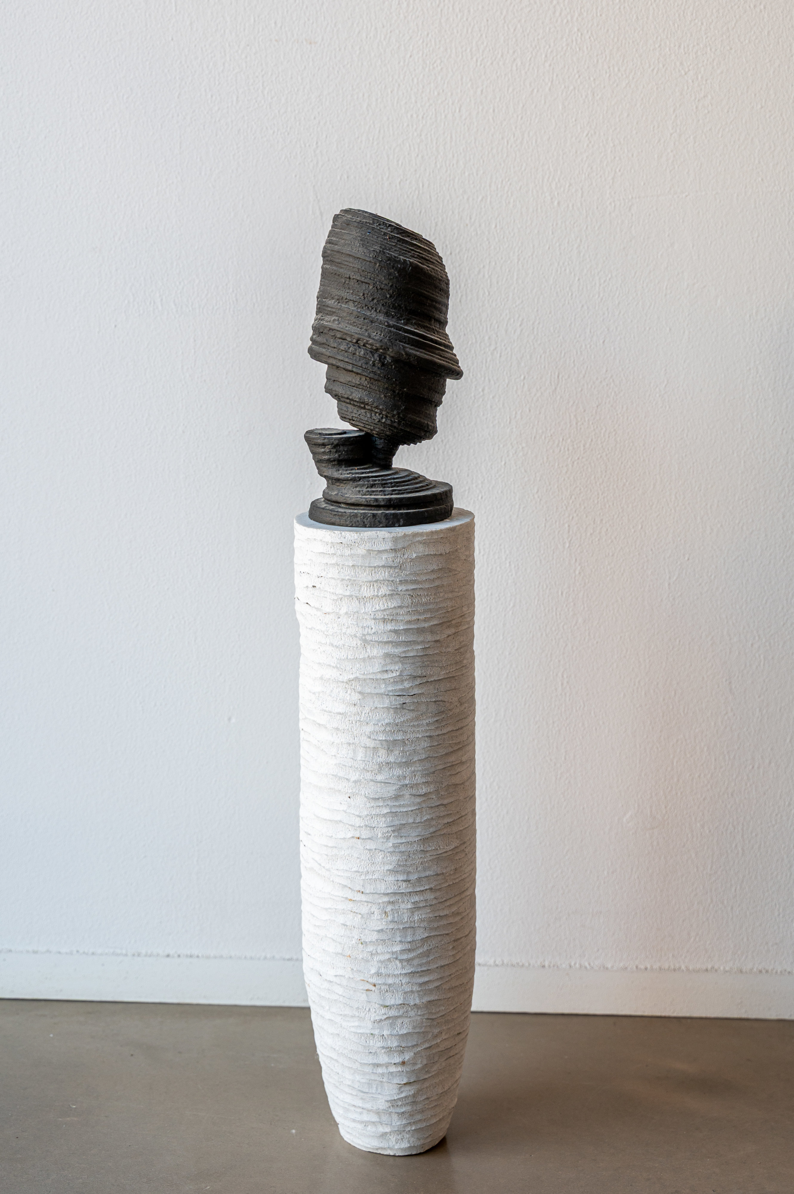 Marco Bagnoli's 1992 sculpture combines marble and ceramic in an intriguing dialogue between permanence and fragility, creating a visual tension that challenges conventional notions of material hierarchy. The work's title—"He Who Stands"—suggests a figure frozen in time, while the juxtaposition of stone's enduring solidity with ceramic's delicate vulnerability invites contemplation on themes of presence, stillness, and human resilience. This hybrid approach exemplifies Bagnoli's distinctive sculptural language that transforms everyday materials into meditations on form and existence.
