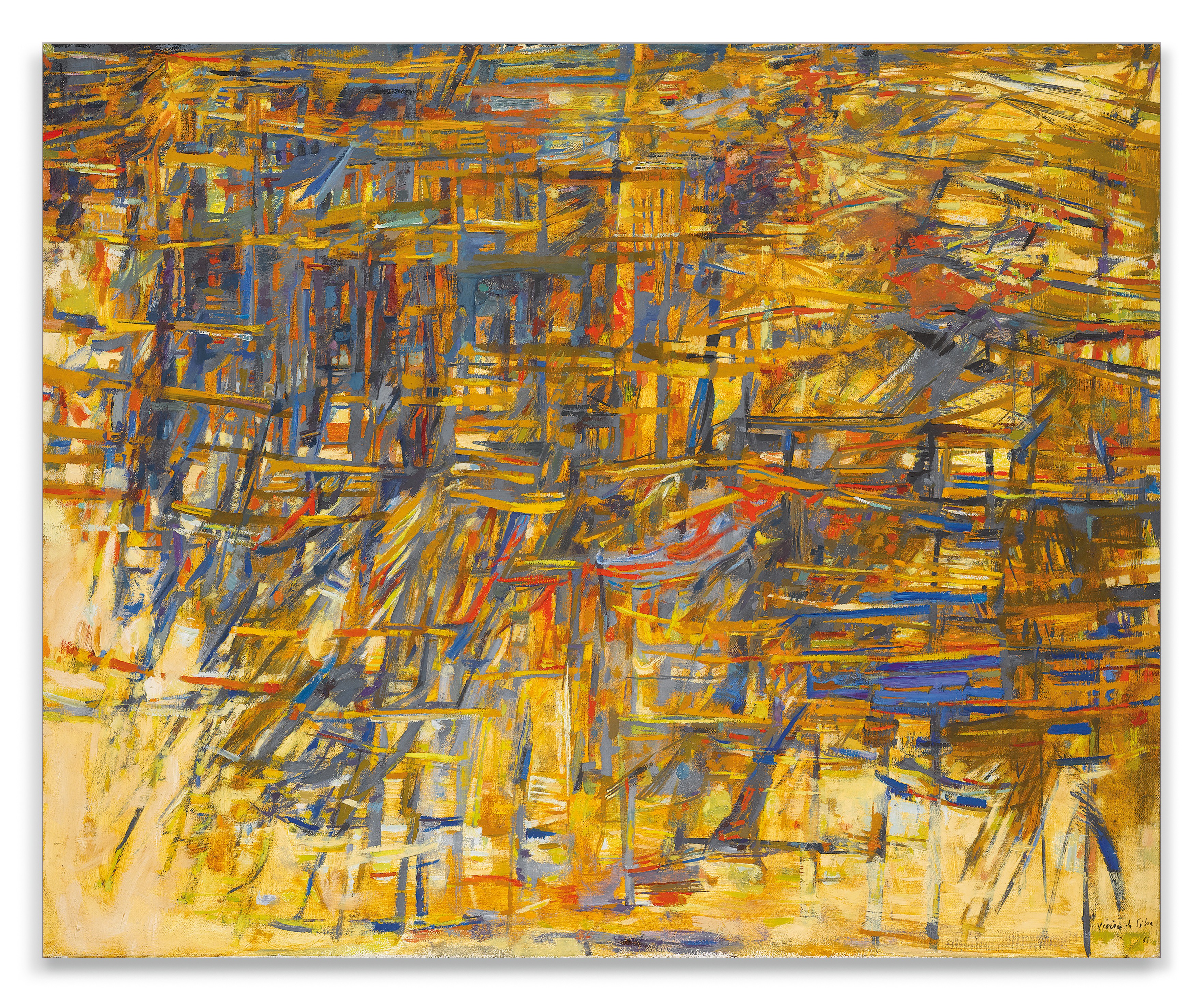 Maria Helena Vieira da Silva's 1961 oil on canvas 'Automne' presents an abstract composition evocative of autumn themes. The work demonstrates her distinctive style of creating intricate, labyrinthine compositions through subtle color and mark-making.