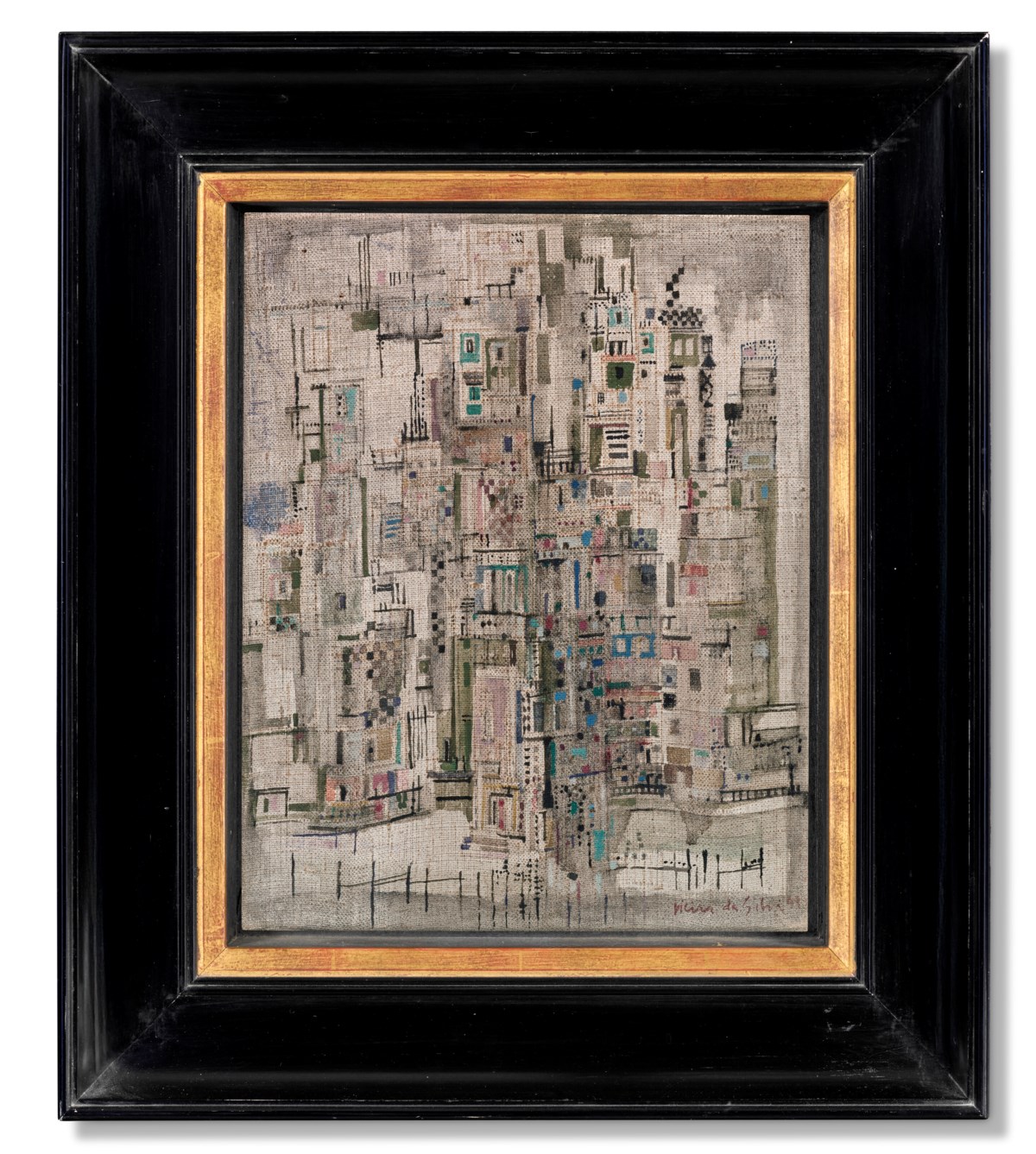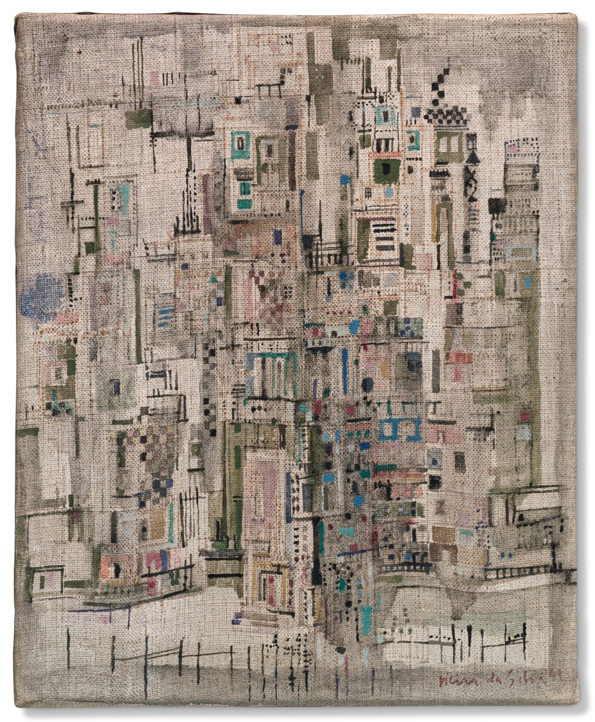 A labyrinthine cityscape emerges from da Silva's intricate web of intersecting lines and fragmented planes, rendered in gouache and ink on prepared canvas. Her characteristic all-over composition dissolves architectural forms into a restless, vibrating network of marks that blur the boundary between urban structure and pure abstraction. The dense, mosaic-like surface pulses with energy, evoking the disorienting yet exhilarating experience of navigating a teeming metropolis.