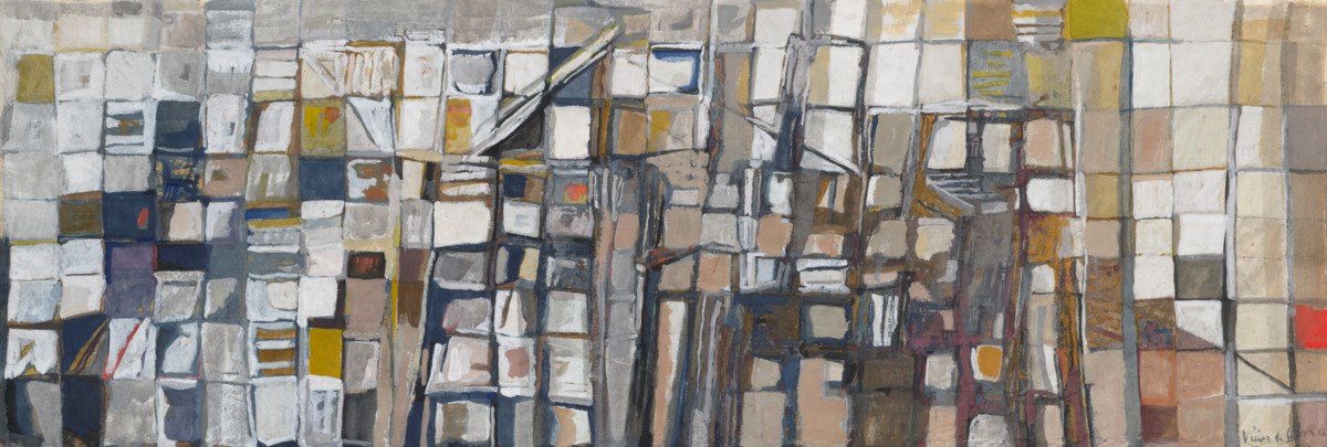A labyrinthine web of delicate lines and fragmented forms fills the composition, creating a sense of infinite, shifting space reminiscent of an attic or interior architecture seen through a fractured lens. Vieira da Silva's masterful layering of tempera and watercolour produces a luminous, almost trembling surface where warm and cool tones flicker across the intricate network of marks. The work exemplifies her distinctive approach to abstraction, dissolving solid structure into a dynamic, atmospheric field that hovers between order and dissolution.