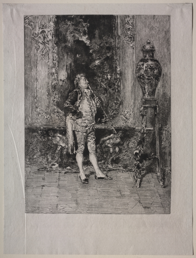 Intimate domestic spaces come alive through Fortuny's masterful etching technique, capturing the interplay of light and shadow that defined his orientalist period.