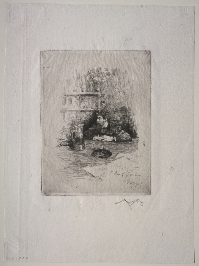 This etching by Spanish artist Mariano Fortuny depicts Eduardo Zamaçois, a fellow Spanish painter and contemporary of the artist. Fortuny's skilled handling of the etching needle creates a portrait of refined technique, with careful attention to the subject's facial features and the play of light and shadow across the composition. The work exemplifies Fortuny's mastery of printmaking and his ability to capture the character and prominence of his artistic peers during the nineteenth century.