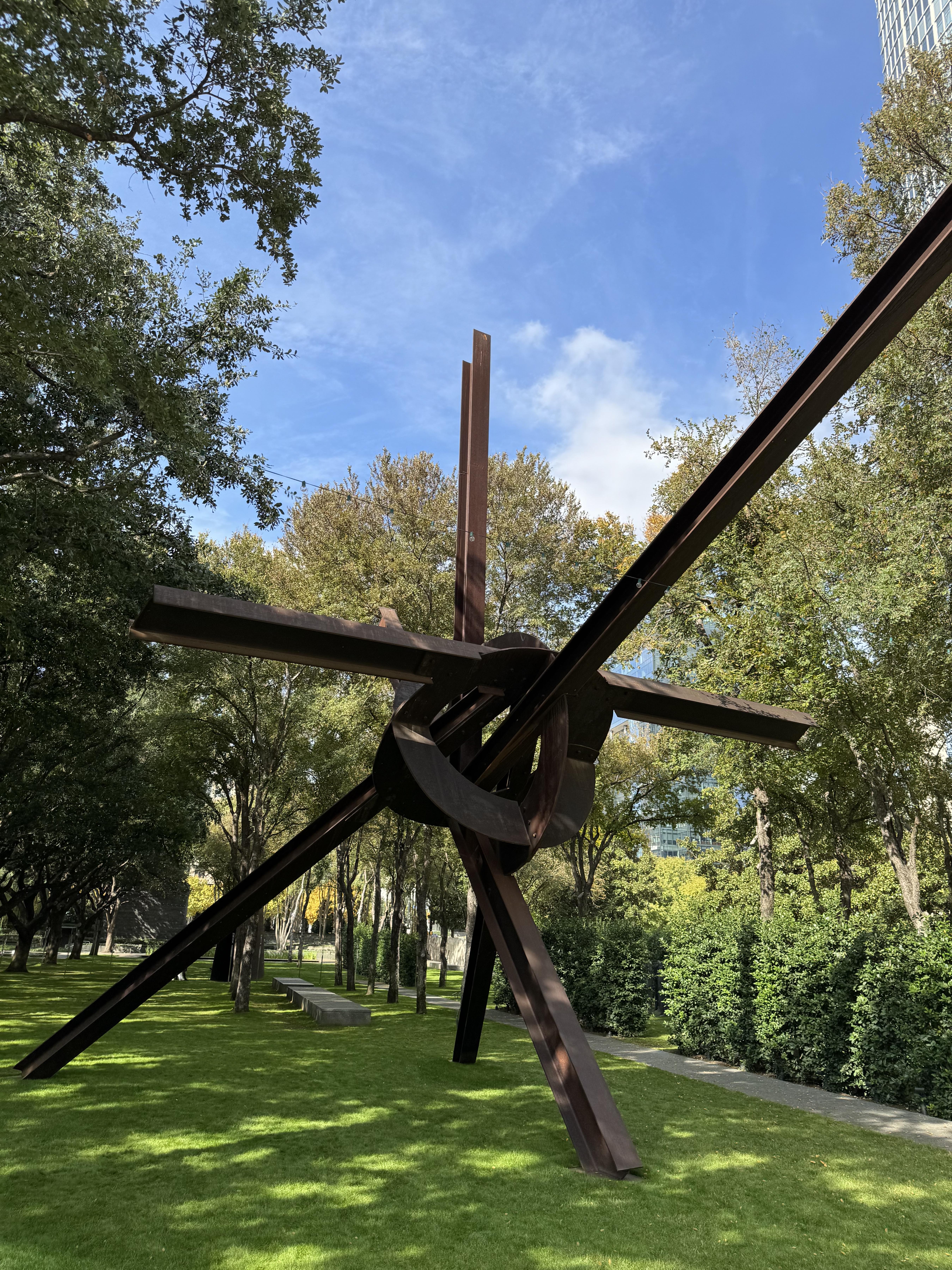 A monumental work by Mark di Suvero, 'Ave' exemplifies the artist's signature use of industrial I-beams to create dynamic, open-form compositions. This Abstract Expressionist sculpture balances immense weight with a sense of gestural energy, its raw steel surface engaging directly with its outdoor environment. The piece is a celebrated highlight of the Nasher Sculpture Center's collection in Dallas.