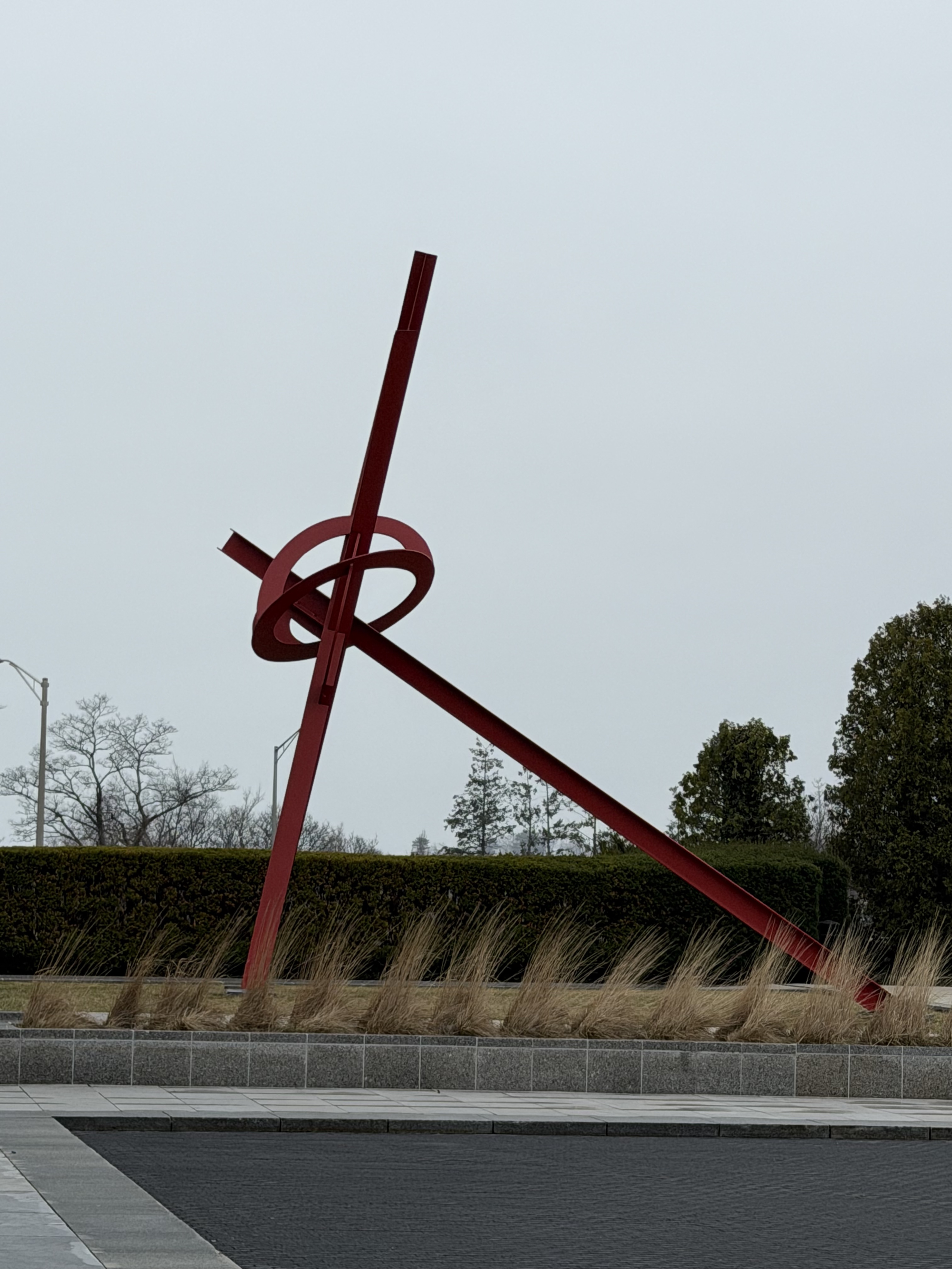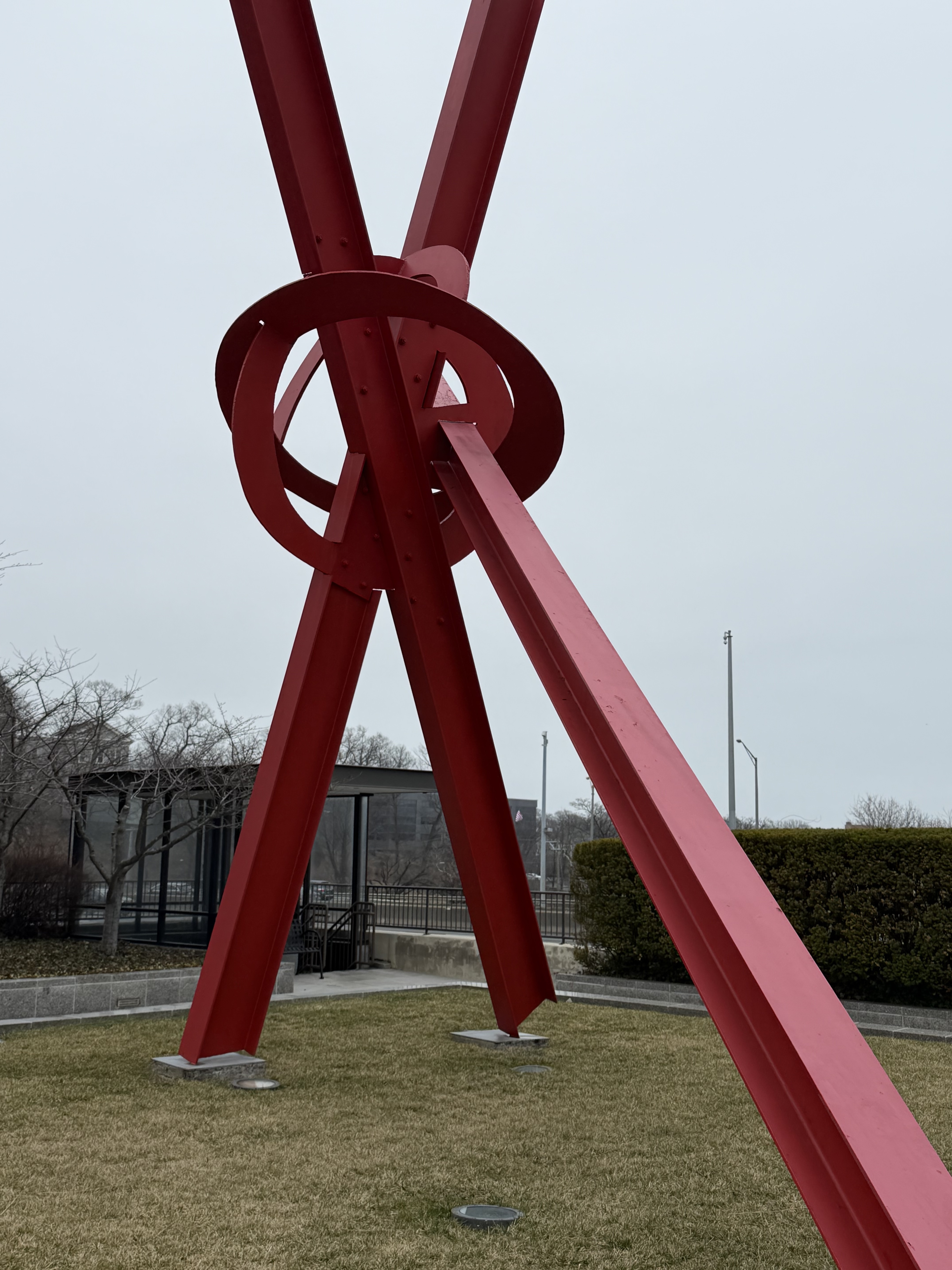 "Borealis" is a monumental 29-foot welded-steel sculpture by internationally renowned artist Mark di Suvero, composed of steel I-beams arranged in a dynamic tripod configuration with an interlocking circular knot element at center, all painted in a bold, eye-catching red. Installed on permanent exhibit at Greenwich Plaza by The Ashforth Company, the work is visible from both I-95 and the Metro-North Railroad. Di Suvero is celebrated globally for his seminal use of industrial steel and cranes in creating large-scale outdoor sculpture. This work exemplifies his signature vocabulary of intersecting structural beams and gestural steel forms.
