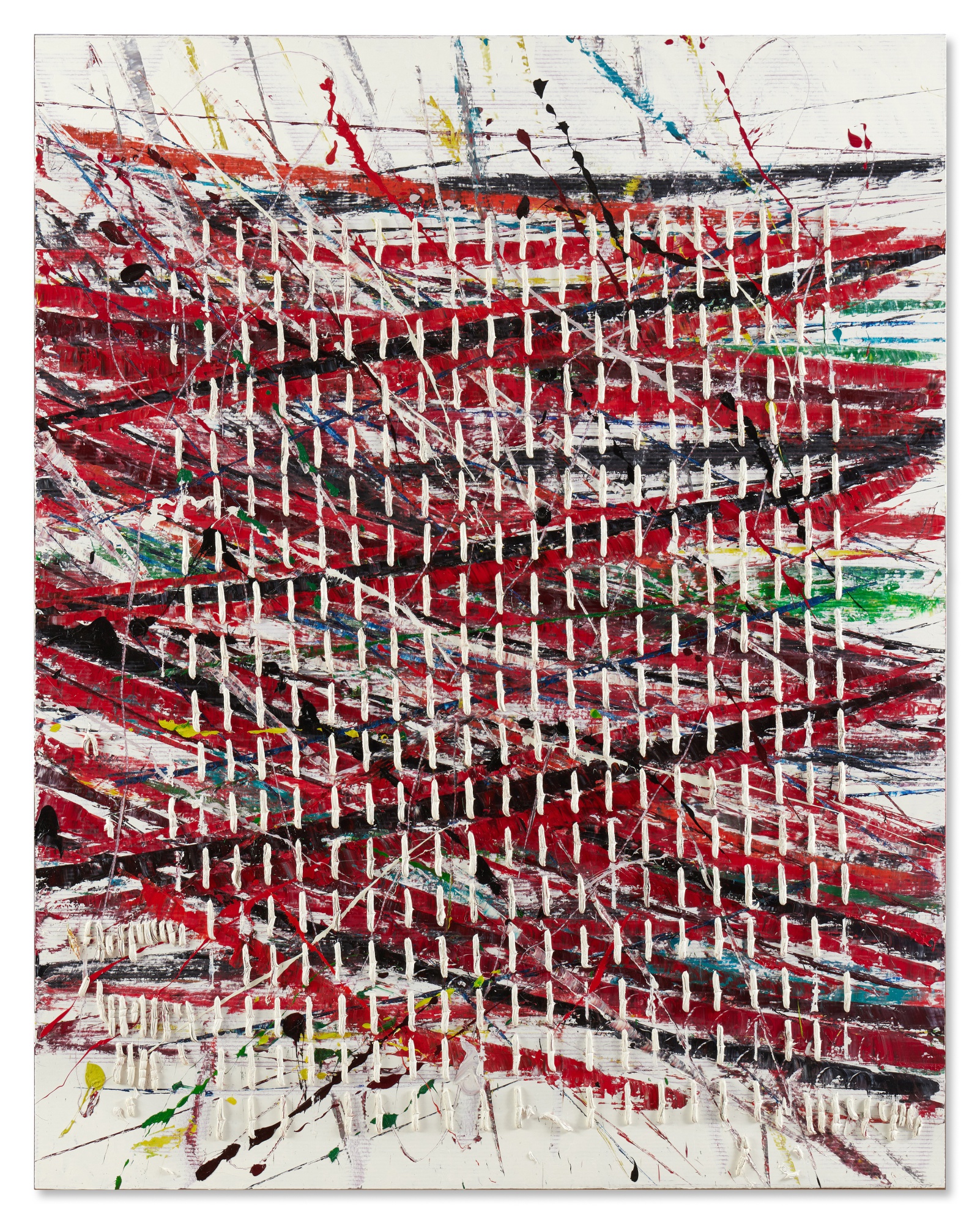 Mark Grotjahn's 2018 'Untitled (Free Capri 50.54)' employs oil on cardboard mounted on linen, merging unconventional supports with traditional painting materials. The work reflects Grotjahn's exploration of abstraction through gestural mark-making and compositional experimentation. The mixed-support approach suggests layering and depth within the composition.