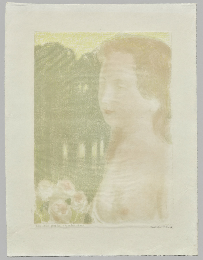 Combining symbolist poetry with visual art, this lithograph demonstrates Denis's integration of text and image within the fin de siècle's synthetic aesthetic philosophy.
