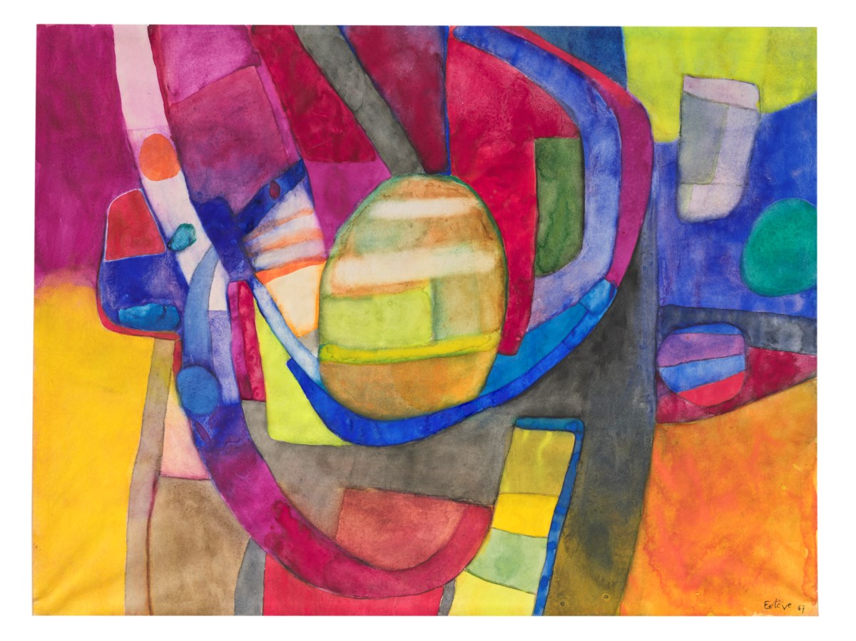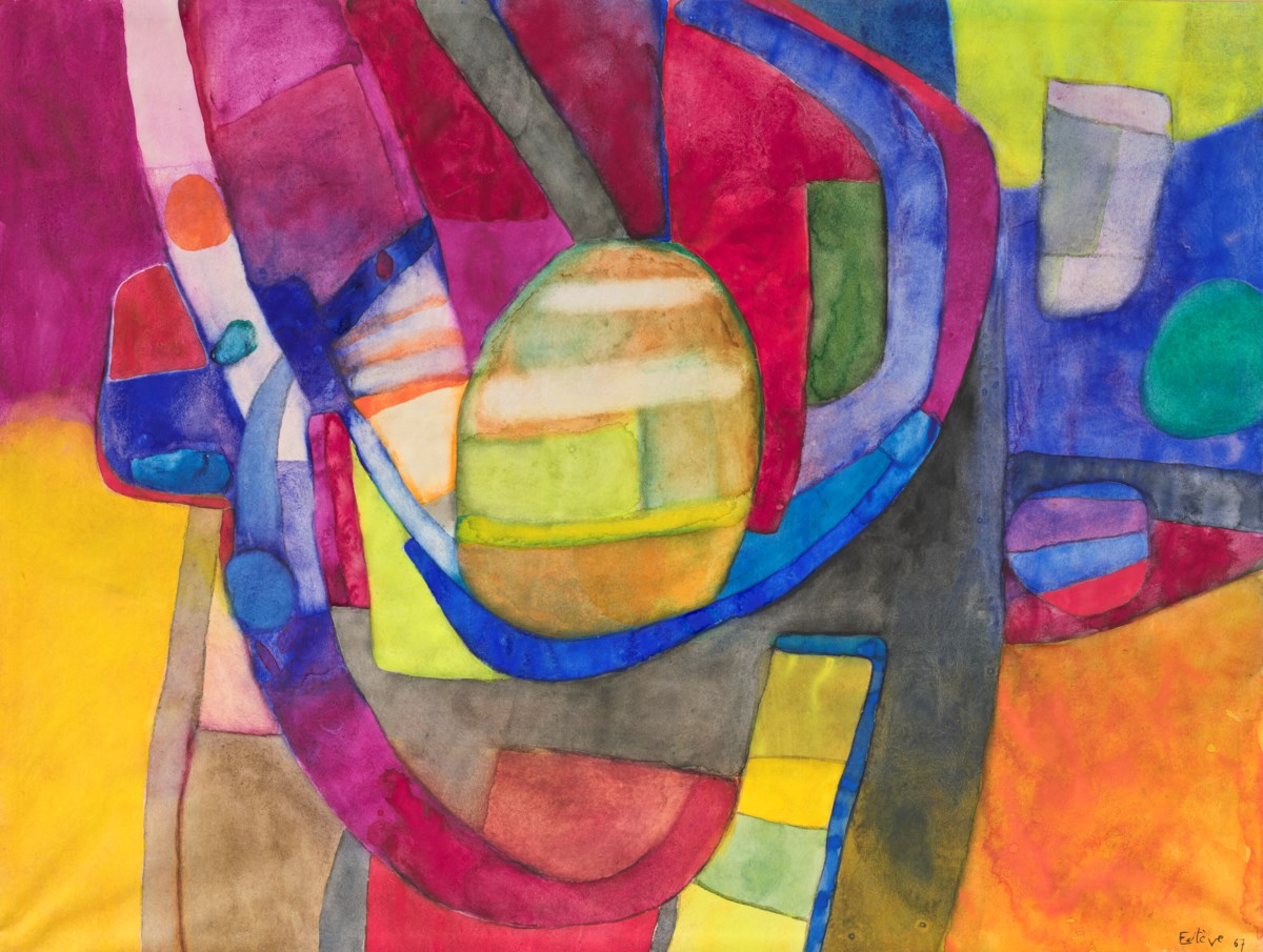 A vibrant interplay of bold, interlocking forms fills the composition with Estève's characteristic sense of rhythmic energy and chromatic richness. Fluid shapes in warm and cool tones overlap and merge, creating a dynamic tension between abstraction and organic suggestion. The gouache and watercolor mediums lend the work both opacity and luminous transparency, reflecting Estève's masterful command of color as a structural and expressive force.