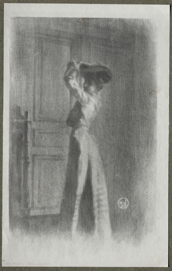 Art Nouveau elegance defines this lithographic portrait, capturing the period's idealized feminine beauty through flowing lines and fashionable contemporary dress.