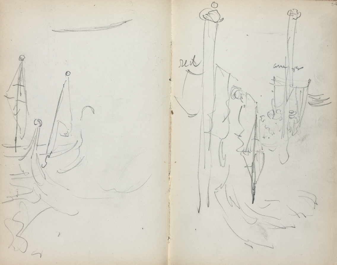 This pencil sketch captures the bustling activity of Venice's harbor with Prendergast's characteristic loose, gestural linework that conveys movement and atmospheric effects. The drawing demonstrates the artist's keen observational skills in recording the play of light on water and the architectural forms of boats and buildings typical of his Italian travel studies. Created during his formative travels in Italy, this work exemplifies Prendergast's approach to capturing fleeting impressions in his sketchbooks, which served as vital source material for his more finished paintings.