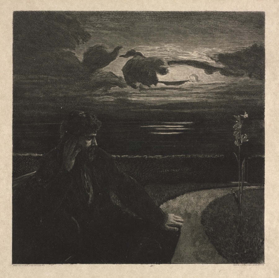 Klinger's masterful etching and aquatint technique serves his symbolist exploration of death's inevitability, combining realistic detail with dreamlike, allegorical elements.