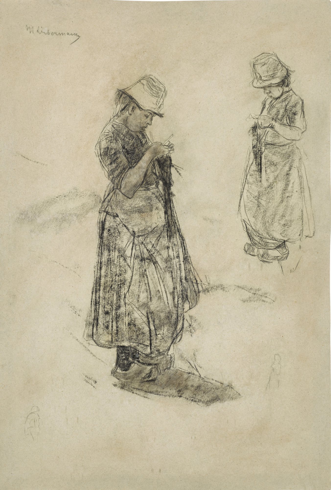 Max Liebermann's 1895 charcoal drawing 'Strickende Mädchen' depicts girls engaged in knitting with gentle realism and intimate observation. The work exemplifies Liebermann's interest in domestic scenes and his skilled draughtsmanship.