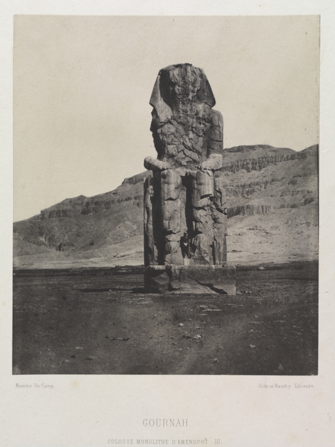 Among the earliest photographic documentation of ancient Egyptian monuments, this salted paper print captures the weathered grandeur of a colossal statue using cutting-edge 19th-century photographic techniques. Du Camp's archaeological photography played a crucial role in bringing ancient Egyptian art to European scholarly attention.