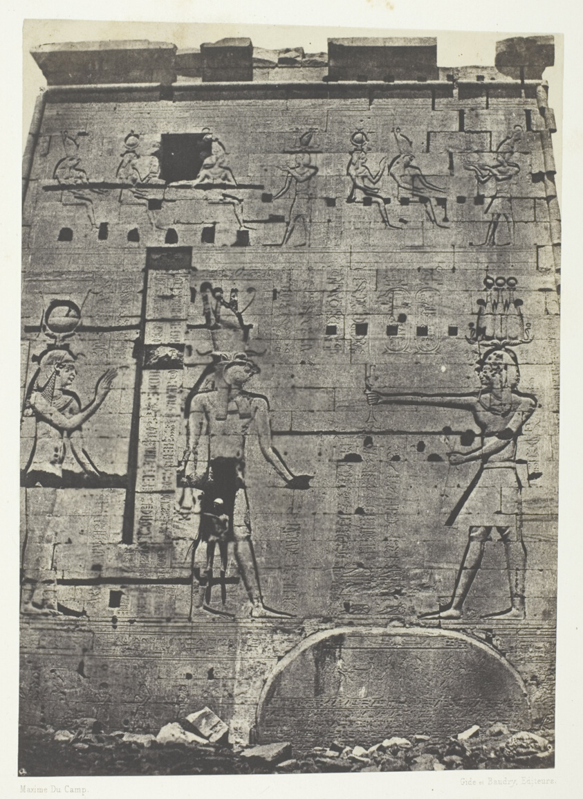 The second pylon of Philae's grand temple demonstrates the monument's impressive scale and architectural hierarchy. Du Camp's systematic approach documented each major structural element of the temple complex.