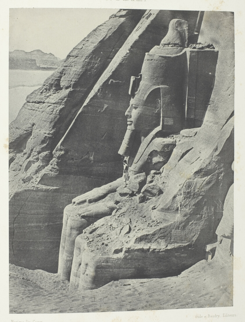 One of the eastern colossi at Abu Simbel appears in profile, emphasizing its monumental scale and idealized royal features. Du Camp's photograph captures the overwhelming presence of Ramesses II's rock-cut temple.