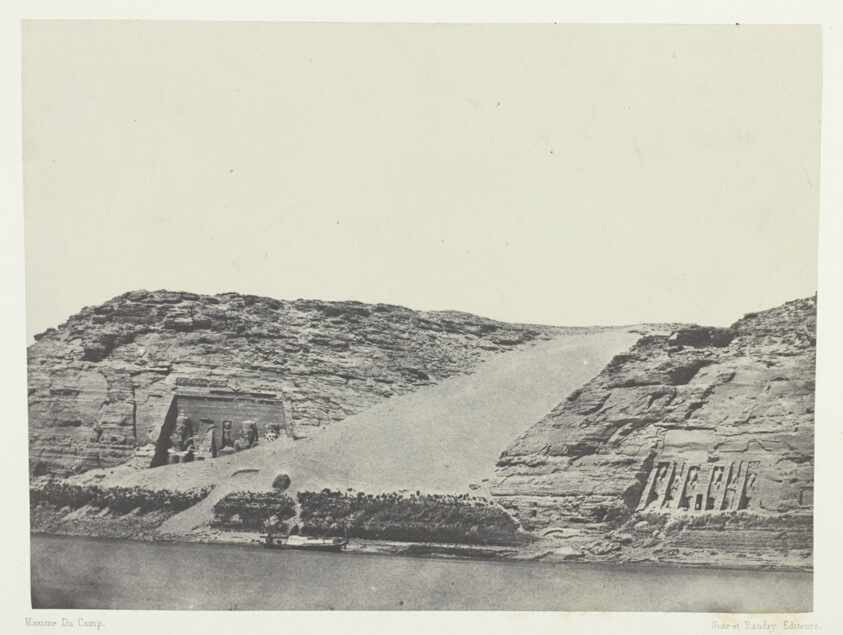 Both the Great and Small Temples of Abu Simbel appear together, showing Ramesses II's complete architectural statement. Du Camp's wide view encompasses the most impressive monument of his entire photographic journey.