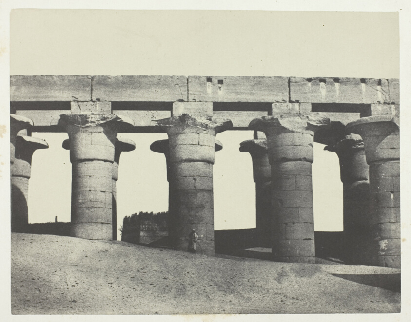 Focusing on Luxor Temple's famous colonnade, this photograph captures the forest of massive columns that exemplifies New Kingdom Egyptian architecture. Du Camp's careful positioning emphasizes both the columns' monumental scale and their elegant proportions.