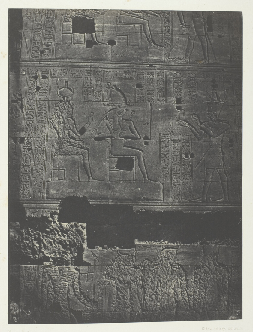The western wall of Philae's main temple showcases the complex's elaborate decorative program in sharp photographic detail. Du Camp's technical skill captured subtle relief variations that drawings could not match.