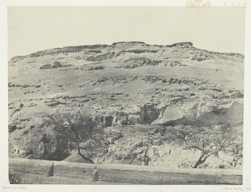 Documenting rock-cut tombs at the ancient site of Asyut, this photograph reveals Du Camp's interest in Egypt's diverse archaeological heritage beyond the famous monuments. The image captures the relationship between ancient architecture and the natural landscape of the Nile Valley.