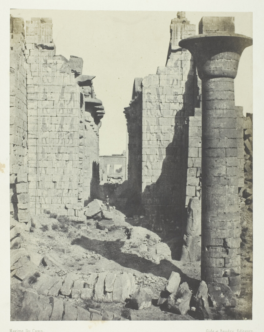 Depicting the entrance to Karnak's famous hypostyle hall, this photograph conveys the overwhelming scale that made such a powerful impression on 19th-century European travelers. Du Camp's technical skill preserves both architectural grandeur and intricate decorative details within a single composition.