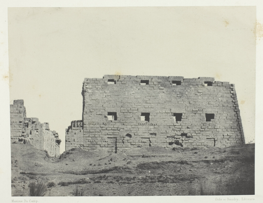 Captured during Du Camp's pioneering photographic expedition with Gustave Flaubert, this image preserves the monumental pylons of Karnak temple complex using the delicate salted paper process.