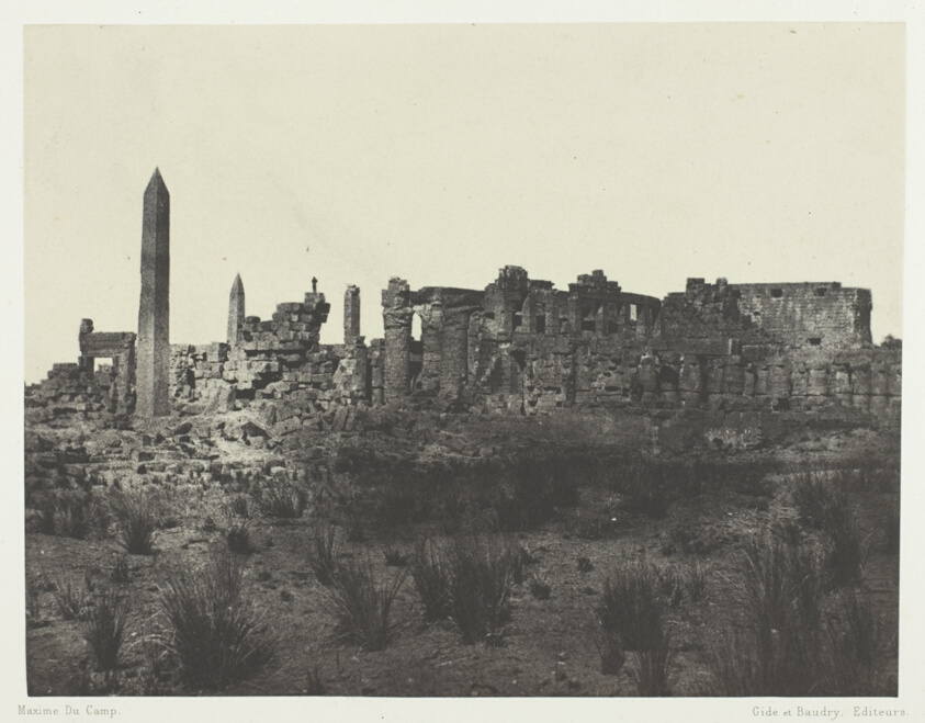 Presenting a sweeping view of the vast Karnak temple complex, this photograph conveys the overwhelming scale of ancient Thebes' religious center. Du Camp's positioning and framing successfully capture both individual architectural elements and the site's magnificent scope.