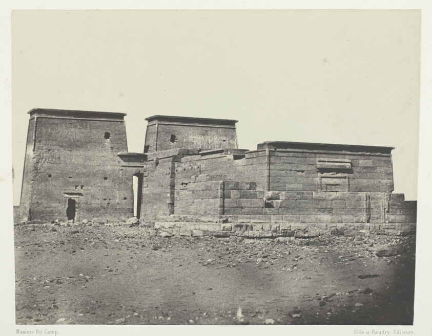 Ancient Pselcis appears in Du Camp's lens as a well-preserved example of Ptolemaic temple architecture in Nubia. His photograph captures the temple's distinctive proportions and decorative elements before later deterioration.