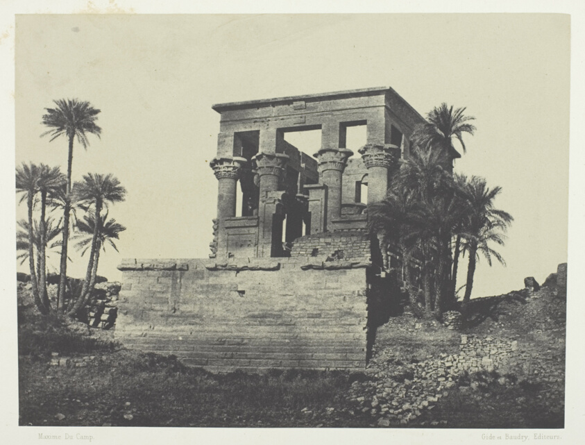 Among the earliest photographs of the Temple of Isis at Philae, this salted paper print documents the hypaethral (open-roofed) sanctuary before the site's later submersion by the Aswan Dam, serving as both artistic achievement and archaeological record.