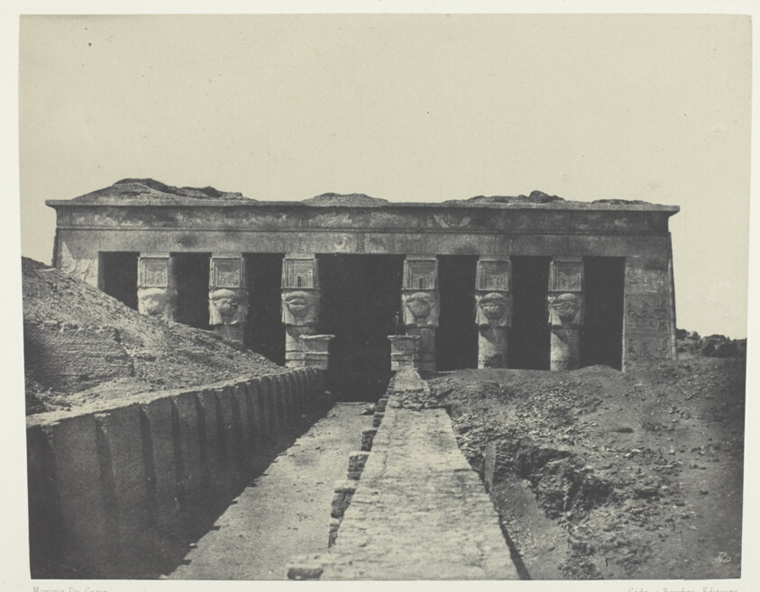 Showcasing the temple complex at Dendera, this photograph demonstrates how early photography could capture entire architectural ensembles that previously required multiple drawings. Du Camp's documentation helped establish photography as an essential tool for archaeological record-keeping.