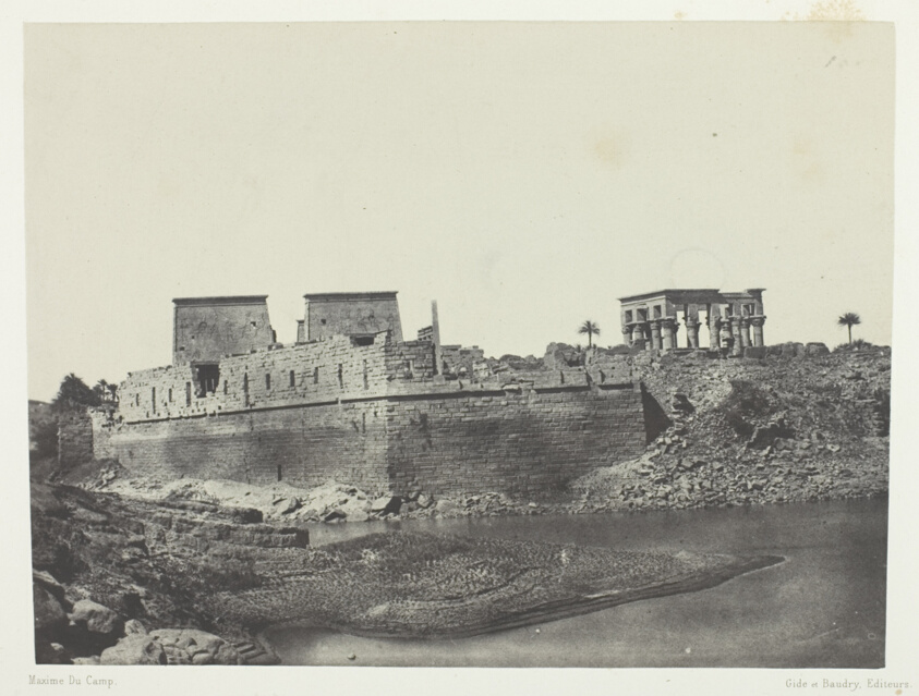Shot from the southwest angle of Philae, this image captures the island temple complex that would later be relocated due to dam construction. Du Camp's photograph serves as crucial historical documentation of the original site before modern interventions.