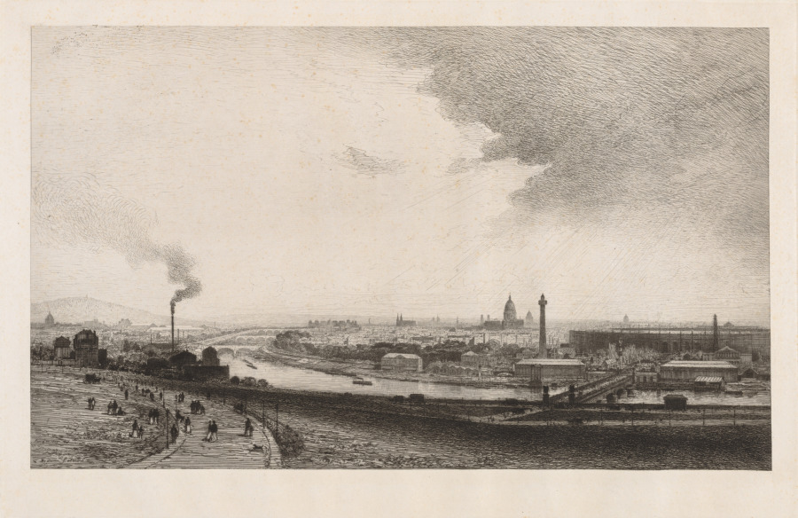 Maxime Lalanne's etching captures a panoramic view of Paris from the Trocadero vantage point during the 1867 Exposition Universelle, showcasing the city's architectural expansion and the Seine winding through the urban landscape. The work demonstrates Lalanne's mastery of the etching medium through its detailed linework and atmospheric perspective, which convey both the grandeur of Second Empire Paris and the technical sophistication of the printmaking process. This print serves as an important documentary record of nineteenth century Paris at a moment of significant modernization and urban development.