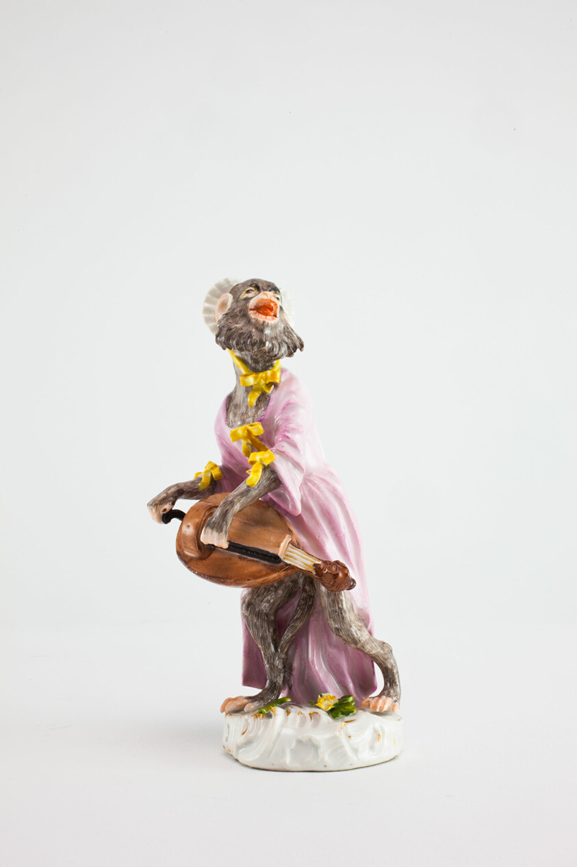 In 1733, the sculptor Johann Joachim Kändler became the chief modeler at the Meissen Porcelain Manufactory, a position he held until his death in 1775. Kändler, along with his assistant Peter Reinicke, devised novel and innovative forms and figures for Meissen porcelain. One of the most admired products of the factory were the monkey bands, witty examples of 18th-century singerie: subjects in which monkeys literally “ape” the behavior of supposedly more sophisticated humans. The first version of the monkey band was designed in 1753 and Madame de Pompadour, mistress of King Louis XV of France and a discerning patron of the arts, ordered a set at Christmas of that year. The group was so popular that it was reissued in the early 1760s. The Art Institute’s monkey band comes from this second edition. In addition to a conductor and two female singers, the orchestra consists of musicians playing wind, string, and percussion instruments. There are also two instruments that were associated with rustic rather than courtly music: the bagpipe and the hurdy gurdy, in which the sound is produced by turning a hand crank that rotates a wheel that bows a set of strings.