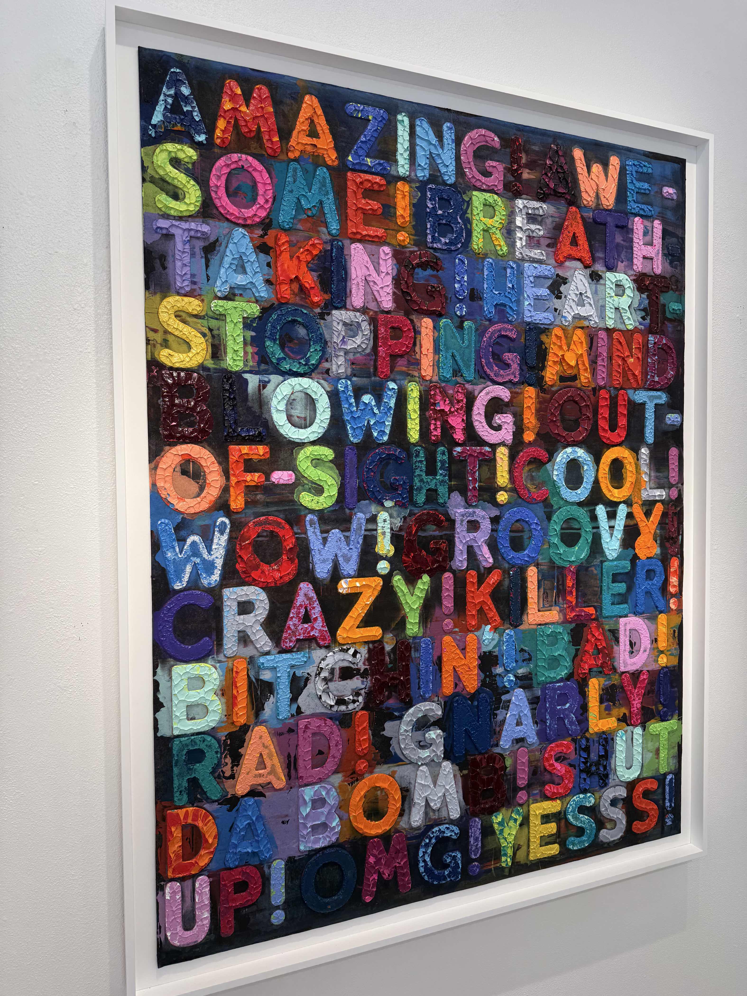 Work spotted. White floater frame. Text content visible includes: AMAZING, AWESOME, BREATHTAKING, HEART STOPPING, MIND BLOWING, OUT OF SIGHT, COOL, WOW, GROOVY, CRAZY, KILLER, BITCHIN, BAD, RADICAL, GNARLY, DA BOMB, IS IT, UP, OMG, YESS.