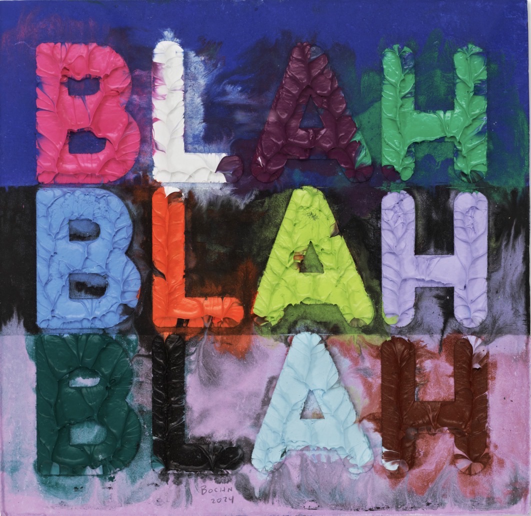 A vibrant example from Mel Bochner's celebrated 'Blah Blah Blah' series, featuring three rows of the word 'BLAH' rendered in thickly impastoed, multicolored letters against shifting dark backgrounds. The heavy, textural application of pigment—each letter in a distinct hue from hot pink and white to teal, orange, and brown—creates a sculptural quality that bridges painting and relief. This work continues Bochner's decades-long exploration of language, meaning, and visual rhetoric, transforming banal verbal filler into a sumptuous material spectacle.