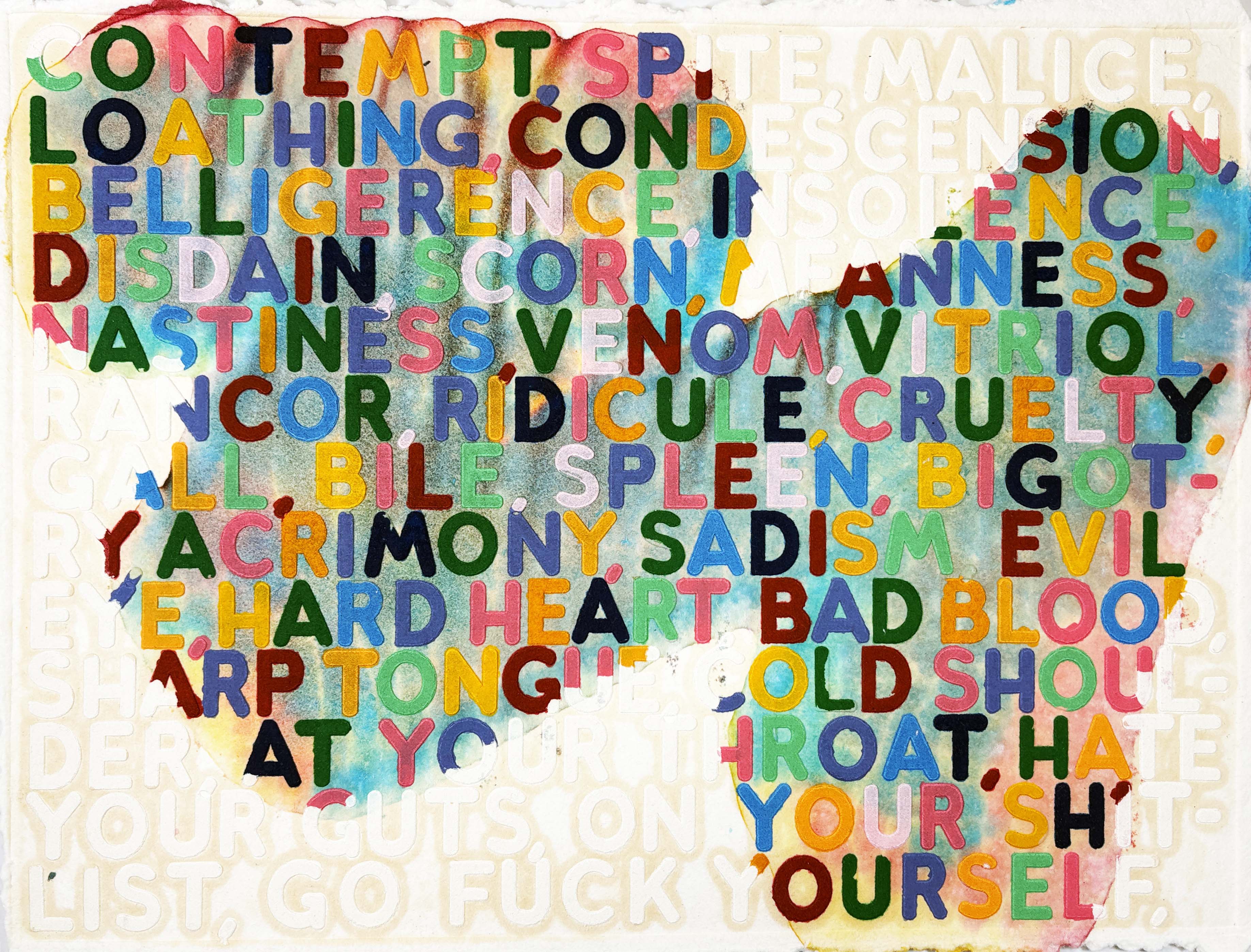 This unique monoprint exemplifies Bochner's ongoing exploration of language as visual form, with the provocative title "Contempt" rendered through his characteristic integration of text and printmaking techniques. The combination of engraving and embossment on hand-dyed Twinrocker paper creates tactile dimensionality that reinforces the emotional weight of the linguistic subject matter.