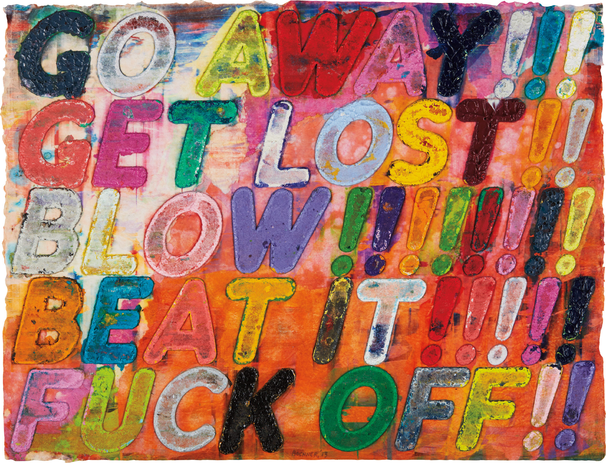Mel Bochner's complex mixed-media monoprint on hand-dyed Twinrocker paper combining collage, engraving, embossing and oil paint in multiple colors. The full sheet presentation emphasizes the work's material richness.