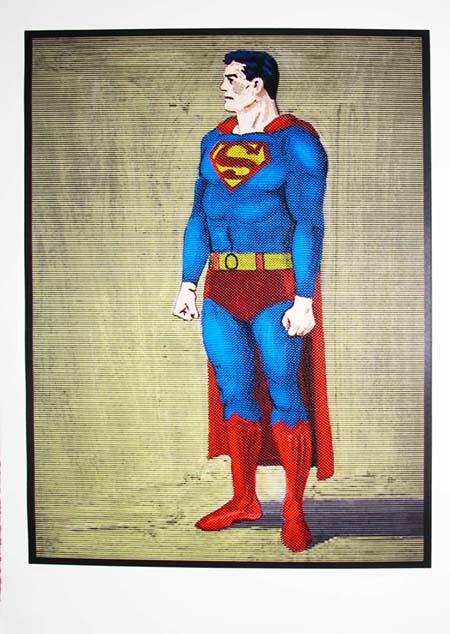 This 2014 woodcut with acrylic demonstrates Ramos's continued engagement with pop culture iconography in his later career, applying his signature bold graphic style to the archetypal American superhero. The work exemplifies the artist's mastery of printmaking techniques while maintaining the vibrant color palette and commercial aesthetic that defined his pop art practice.