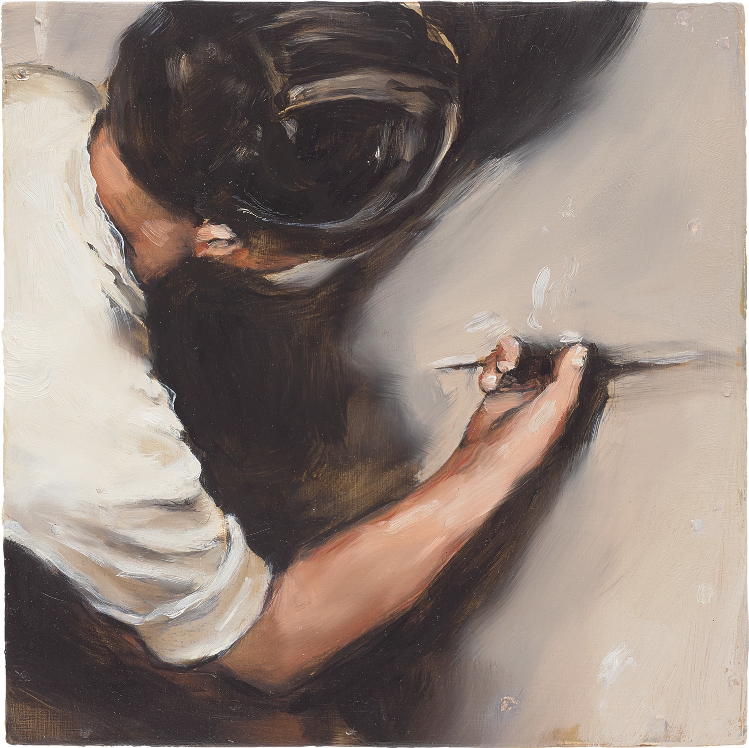 Michaël Borremans' 'The Crack' is an oil painting on panel depicting a seemingly mundane subject with psychological undertones. The work exemplifies Borremans' approach to figuration and subtle narrative tension.