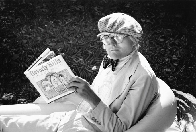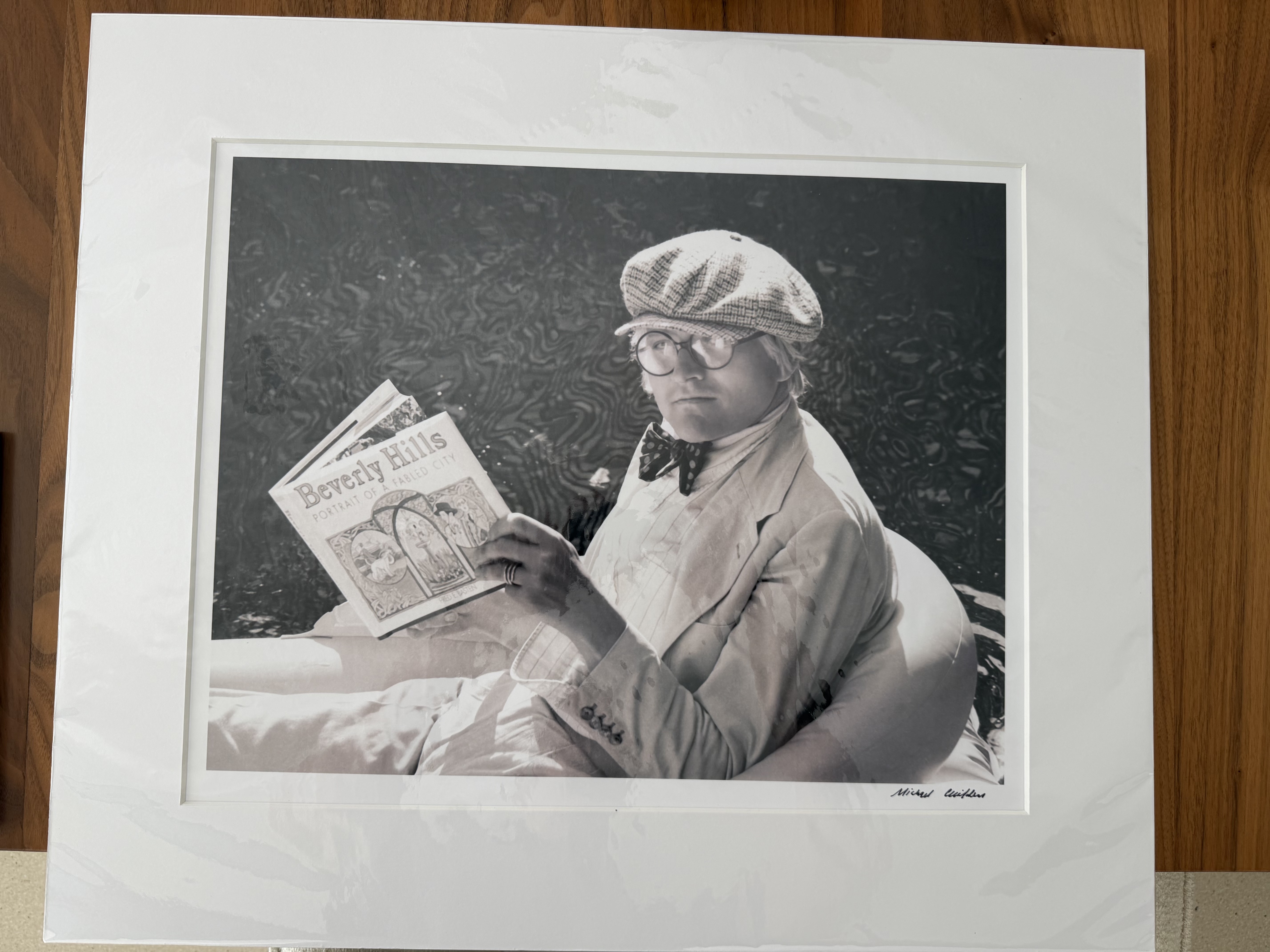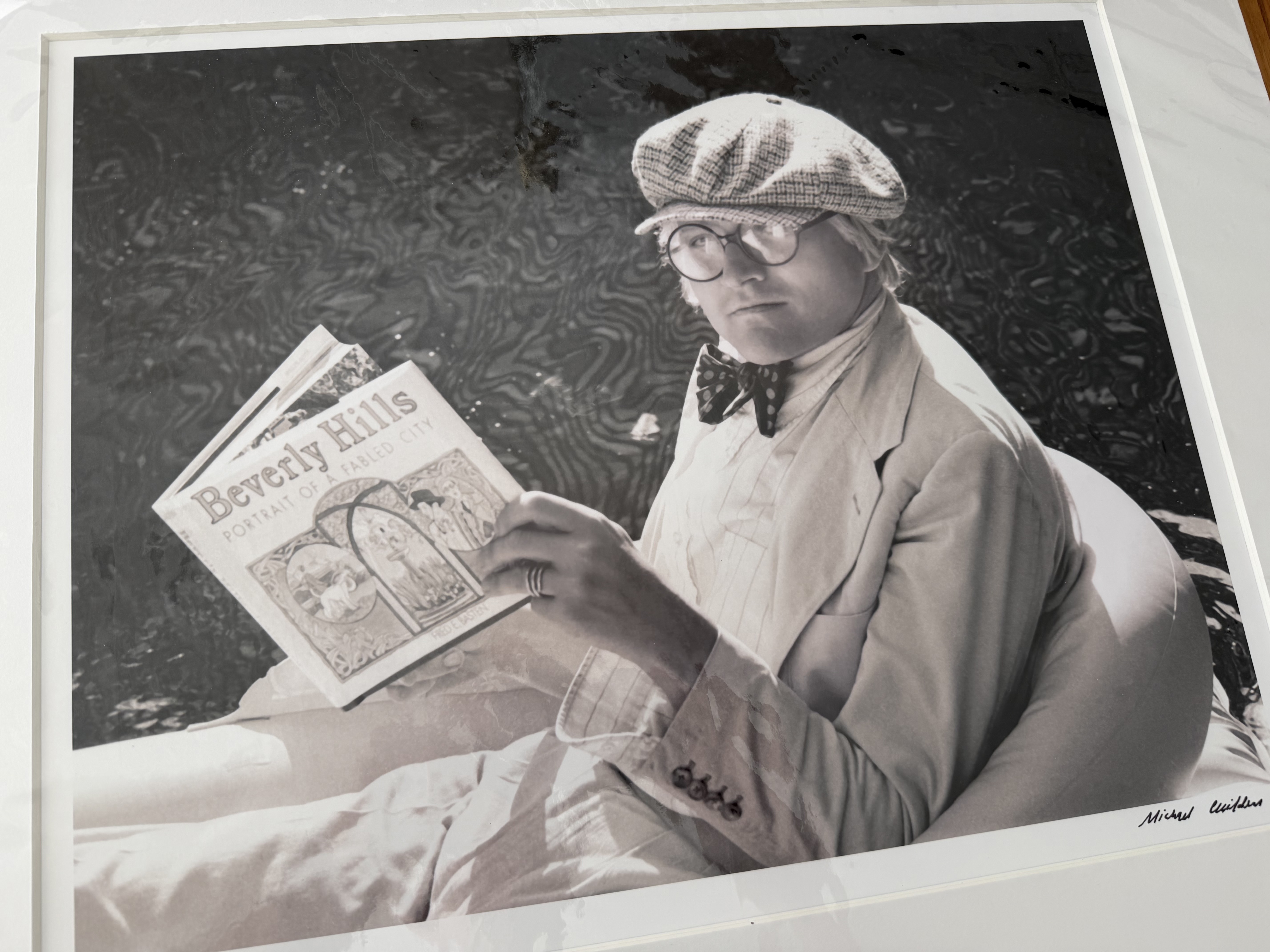 Part of a limited edition set. Certificate of Authenticity included, issued by gallery. Hand-signed by artist (Michael Childers). Subject depicted: David Hockney. Book visible in image: 'Beverly Hills' publication.